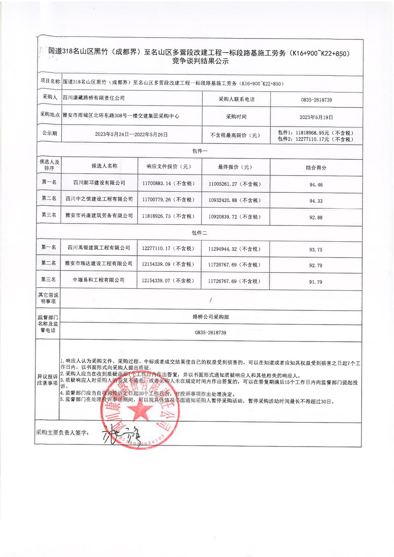 四川康藏路橋有限責(zé)任公司國(guó)道318名山區(qū)黑竹(成都界)至雨城區(qū)多營(yíng)段改建工程一標(biāo)段路基施工勞務(wù)(K16+900~K22+850)競(jìng)爭(zhēng)談判結(jié)果公示