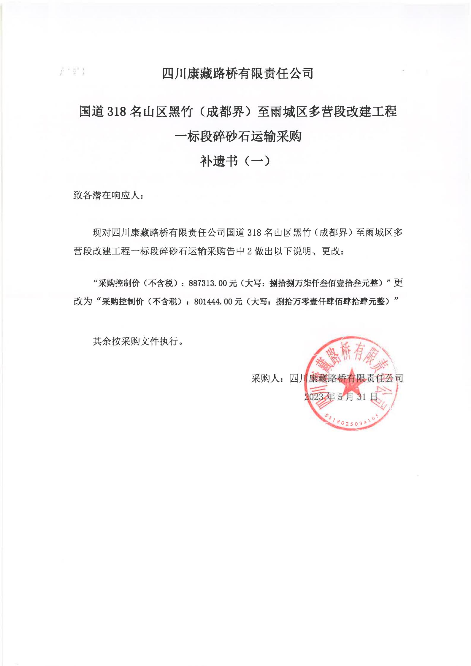 四川康藏路橋有限責(zé)任公司國道318名山區(qū)黑竹(成都界)至雨城區(qū)多營段改建工程一標(biāo)段碎砂石運輸采購補遺書(一)