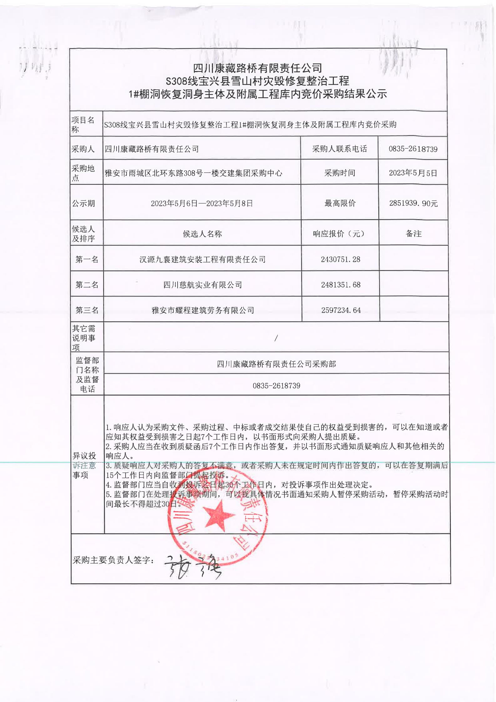 四川康藏路橋有限責(zé)任公司S308線寶興縣雪山村災(zāi)毀修復(fù)整治工程1#棚洞恢復(fù)洞身主體及附屬工程庫內(nèi)競價(jià)采購結(jié)果公示