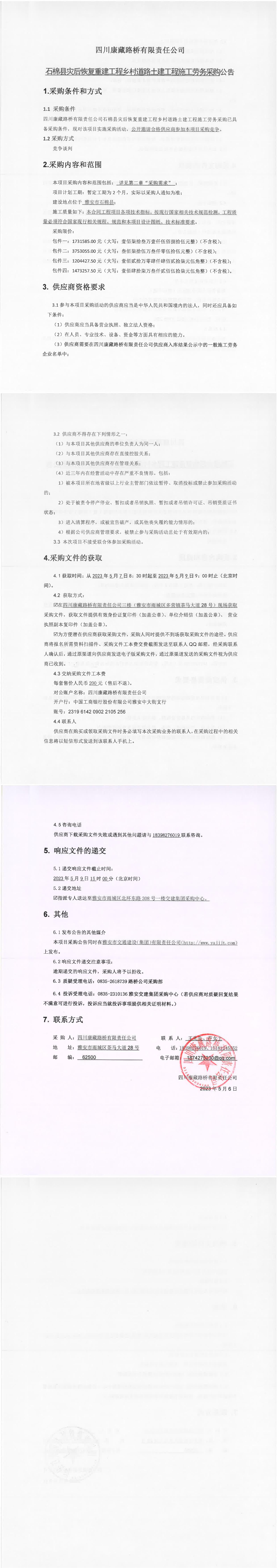 四川康藏路橋有限責(zé)任公司石棉縣災(zāi)后恢復(fù)重建工程鄉(xiāng)村道路土建工程施工勞務(wù)采購公告