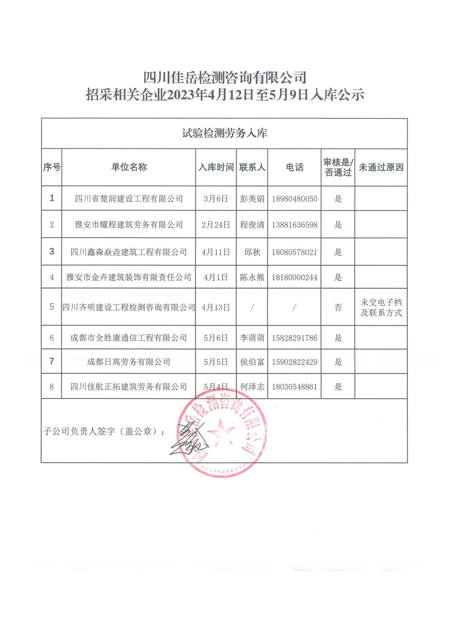 四川佳岳檢測咨詢有限公司(試驗檢測勞務供應商庫)2023年4月12日至5月9日入庫結果公示