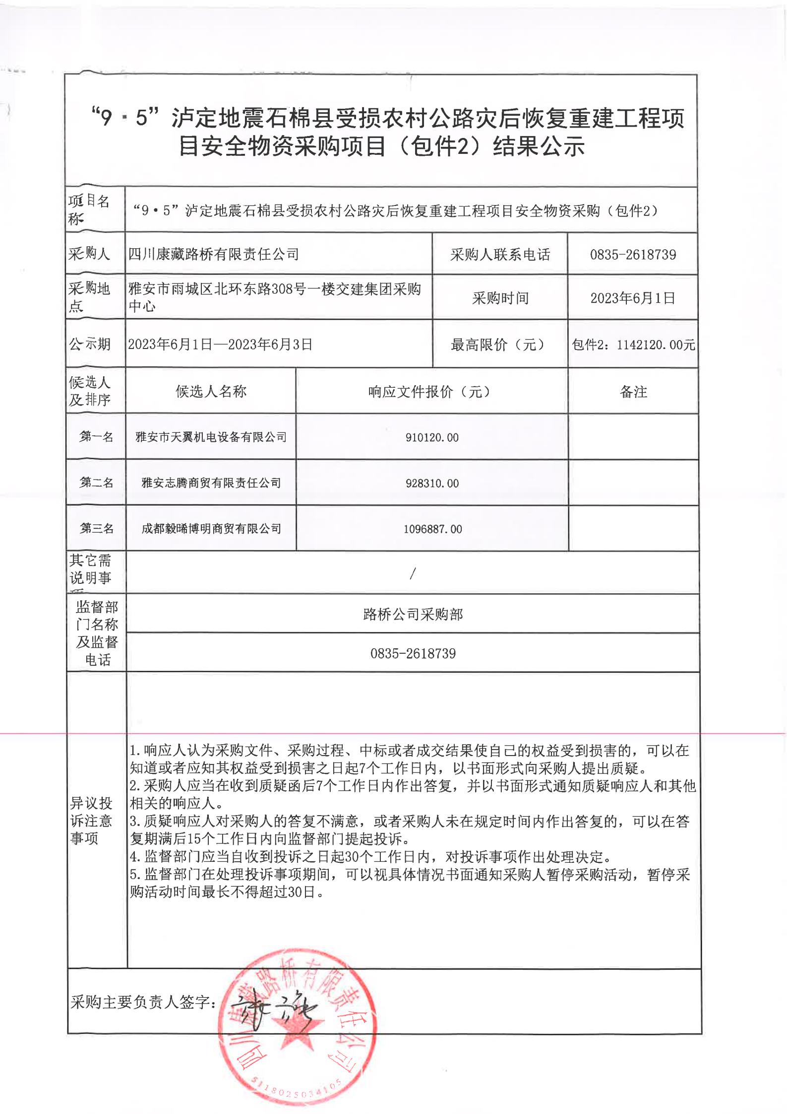 四川康藏路橋有限責(zé)任公司“9·5”瀘定地震石棉縣受損農(nóng)村公路災(zāi)后恢復(fù)重建工程項(xiàng)目安全物資項(xiàng)目(包件2)結(jié)果公示