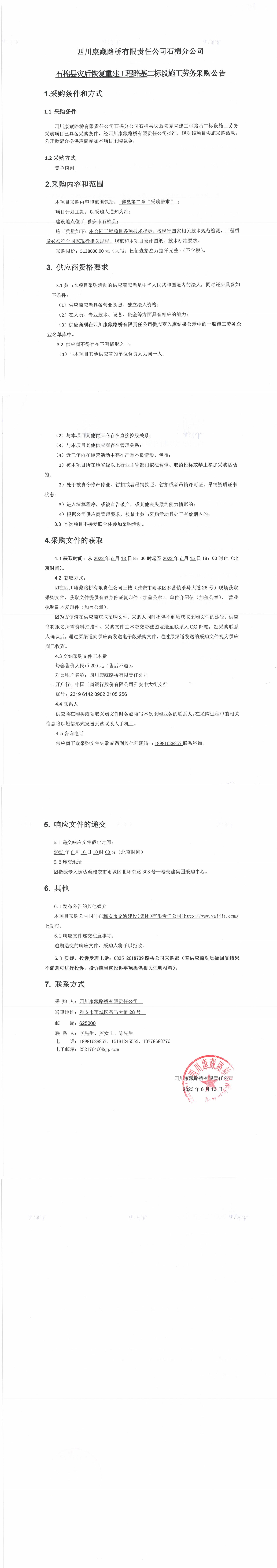 四川康藏路橋有限責任公司石棉分公司石棉縣災(zāi)后恢復(fù)重建工程路基二標段施工勞務(wù)采購公告