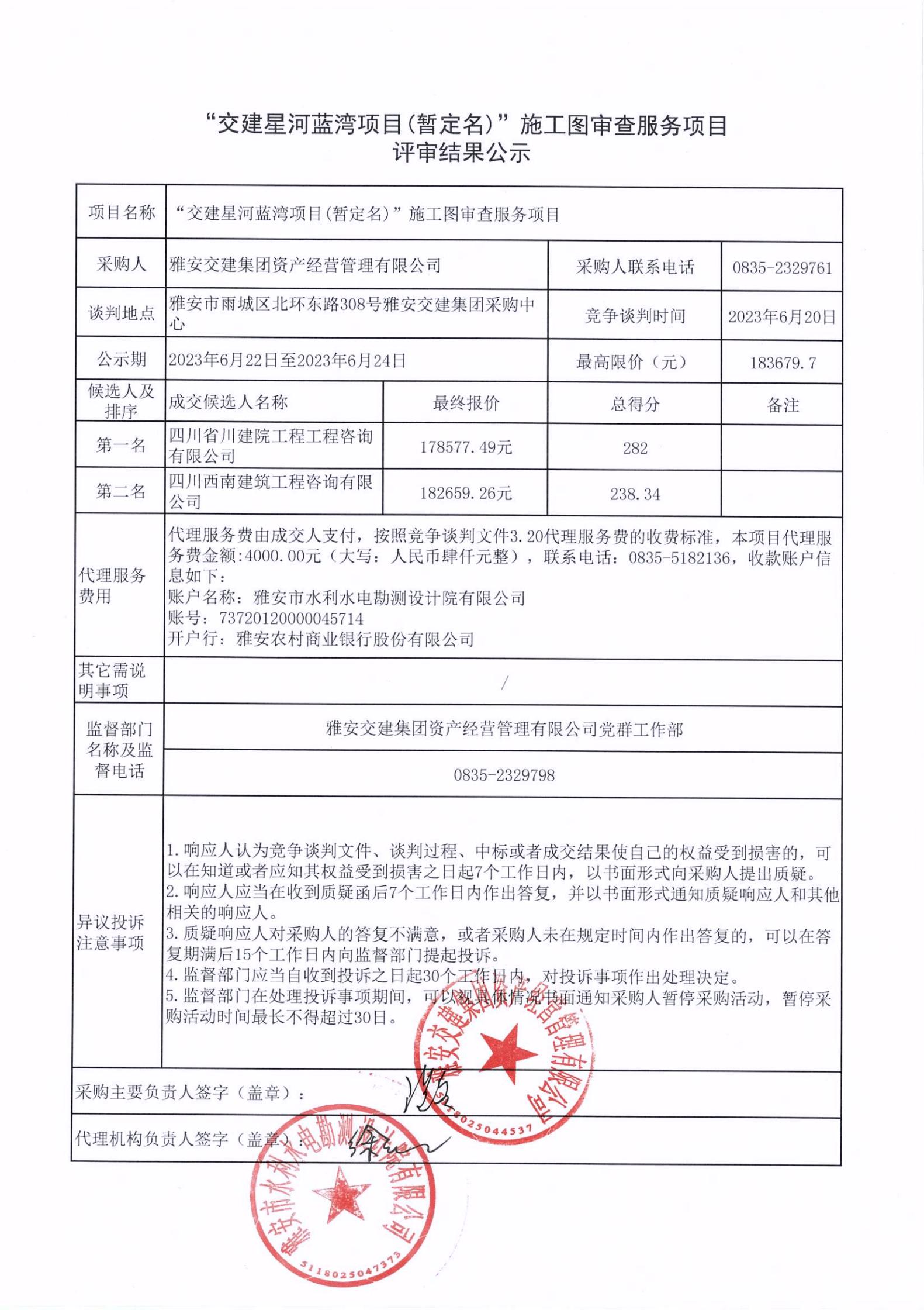 雅安交建集團資產(chǎn)經(jīng)營管理有限公司“交建星河藍(lán)灣項目(暫定名)”施工圖審查服務(wù)項目評審結(jié)果公示