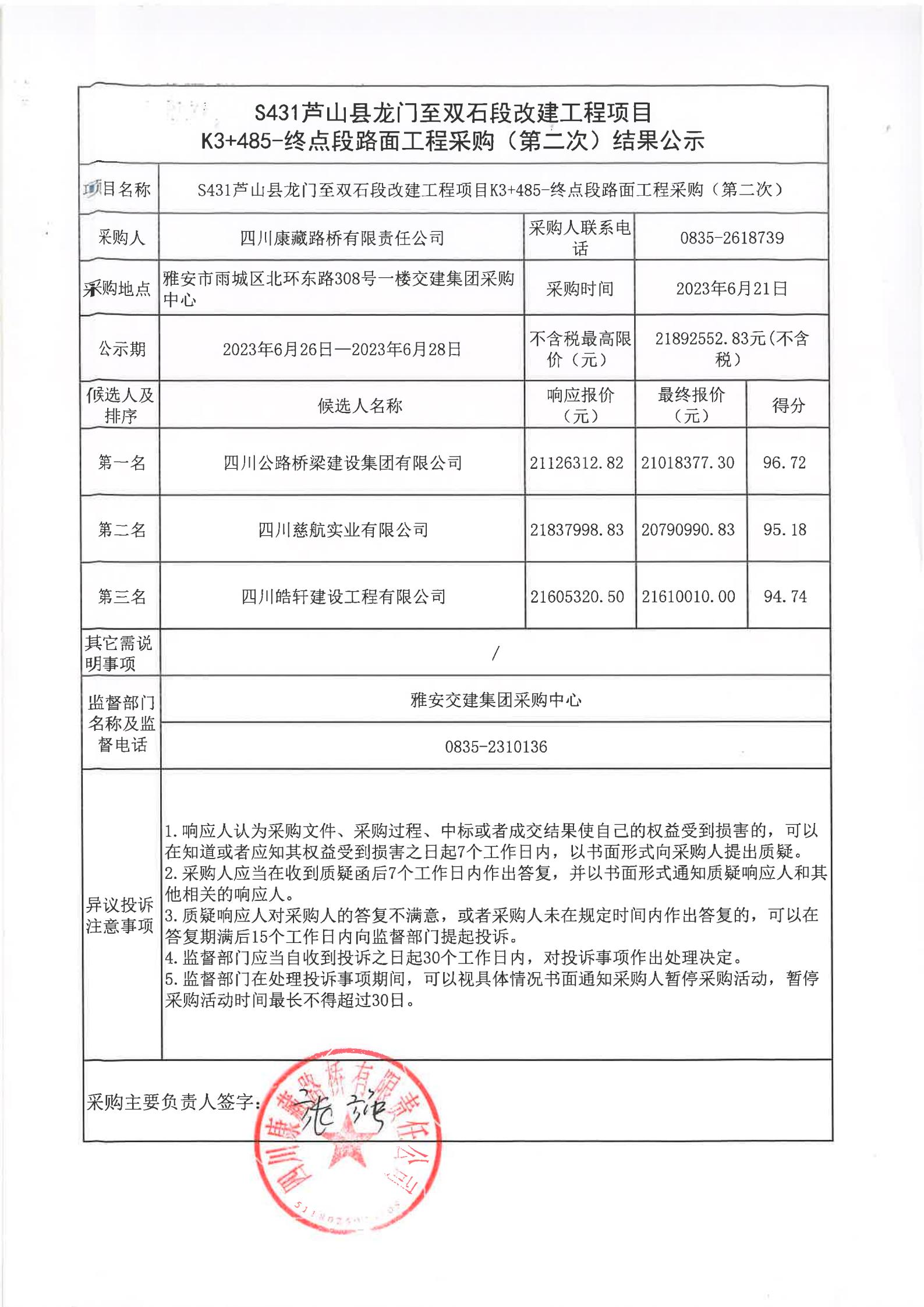 四川康藏路橋有限責(zé)任公司S431蘆山縣龍門至雙石段改建工程項目K3+485-終點段路面工程采購(第二次)結(jié)果公示