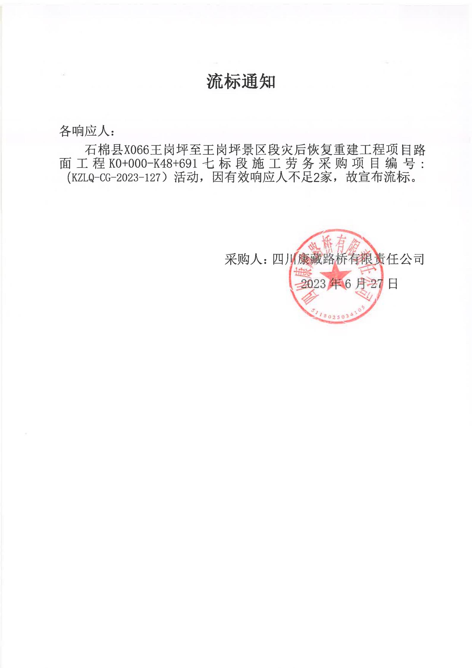 四川康藏路橋有限責(zé)任公司石棉縣X066王崗坪至王崗坪景區(qū)段災(zāi)后恢復(fù)重建工程項(xiàng)目路面工程K0+000-K48+691七標(biāo)段施工勞務(wù)采購流標(biāo)通知