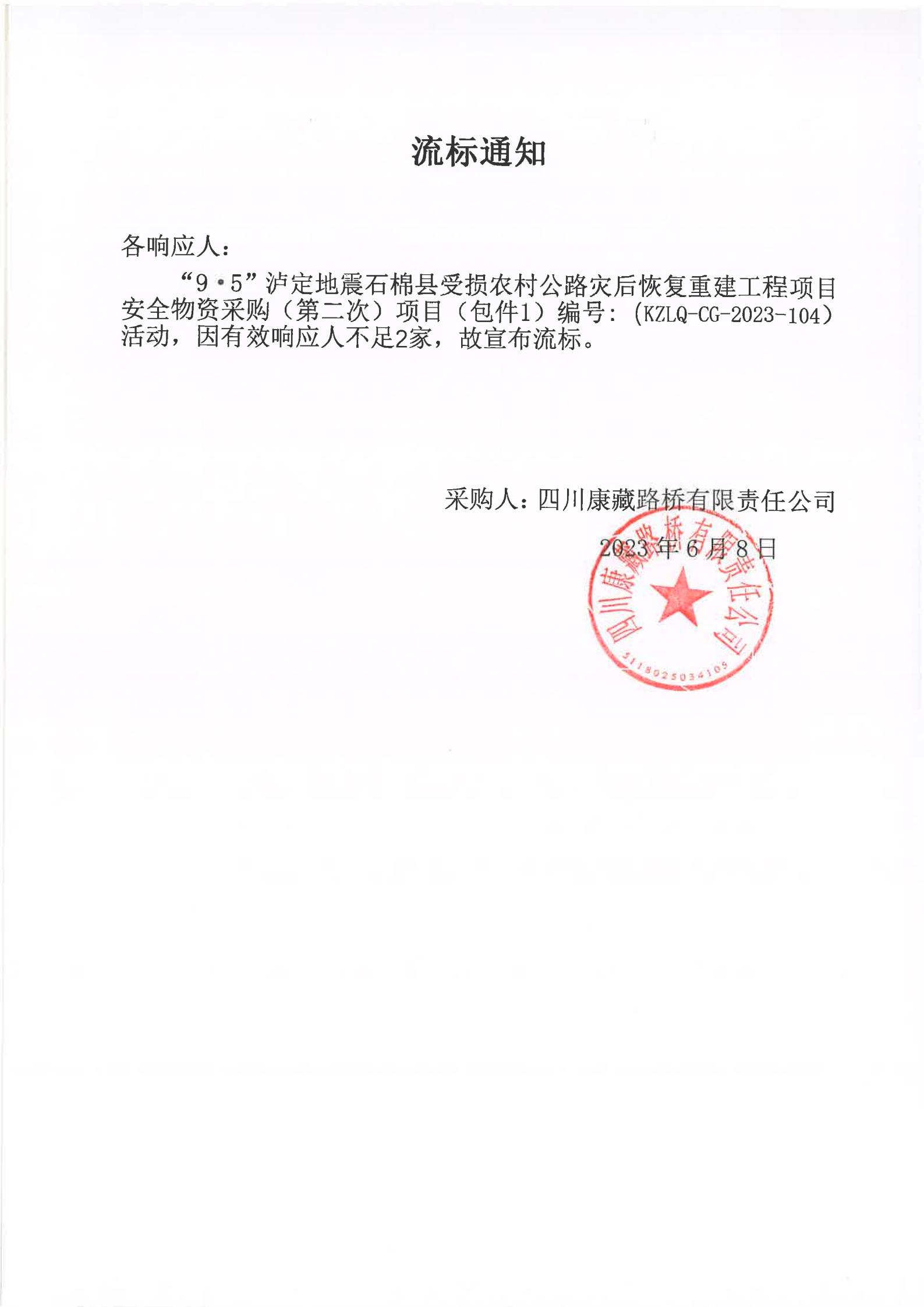 四川康藏路橋有限責任公司“9·5”瀘定地震石棉縣受損農(nóng)村公路災(zāi)后恢復(fù)重建工程項目安全物資競價采購(第二次)流標通知