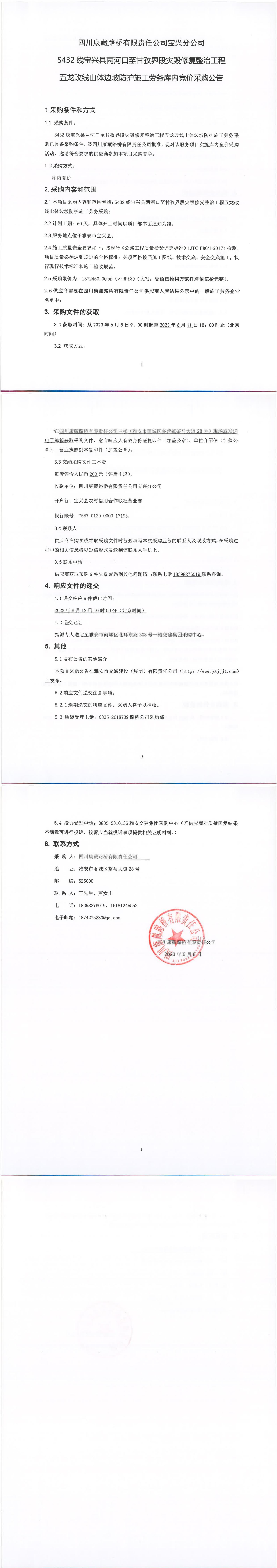 四川康藏路橋有限責(zé)任公司S432線寶興縣兩河口至甘孜界段災(zāi)毀修復(fù)整治工程五龍改線山體邊坡防護(hù)施工勞務(wù)庫(kù)內(nèi)競(jìng)價(jià)采購(gòu)公告
