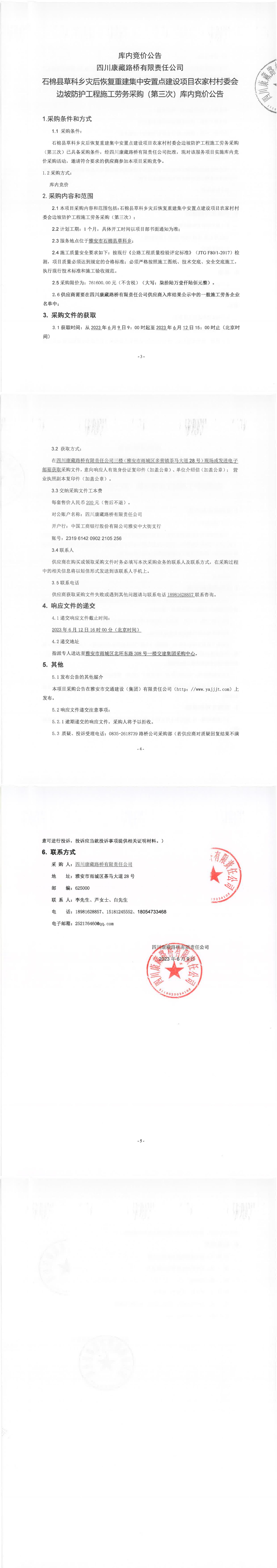 四川康藏路橋有限責(zé)任公司石棉縣草科鄉(xiāng)災(zāi)后恢復(fù)重建集中安置點建設(shè)項目農(nóng)家村村委會邊坡防護(hù)工程施工勞務(wù)采購(第三次)庫內(nèi)競價公告