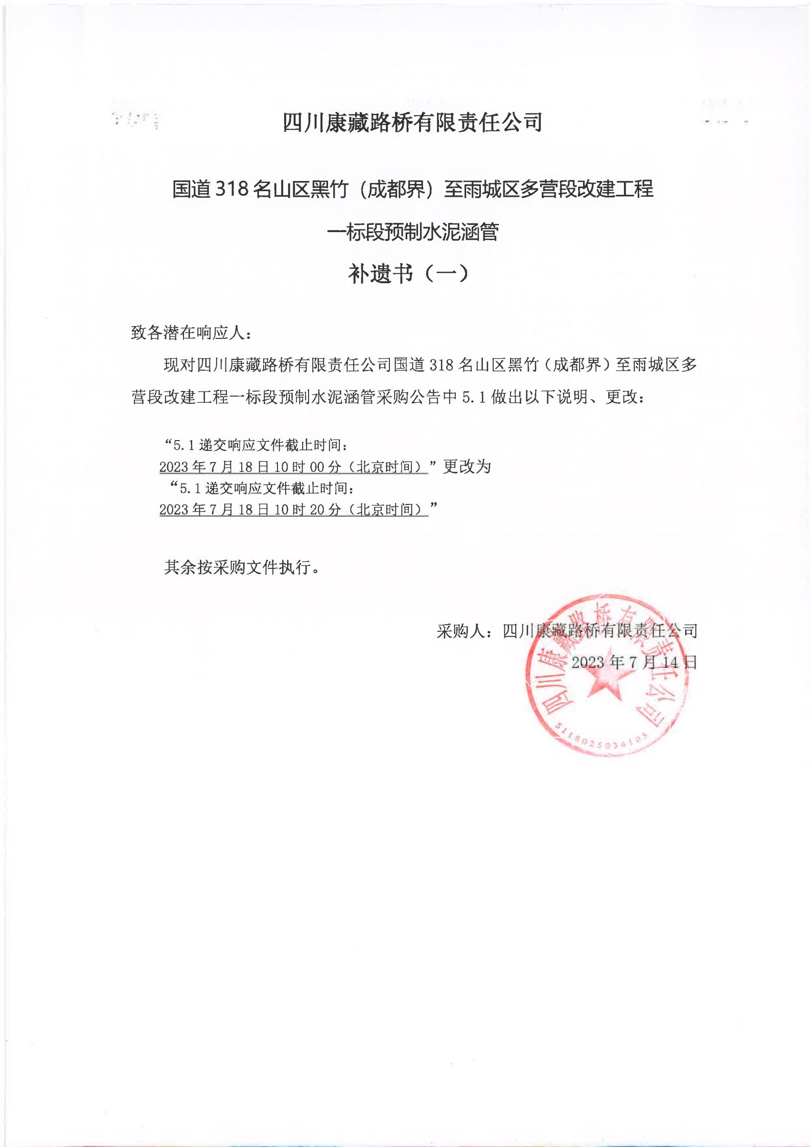 四川康藏路橋有限責任公司國道318名山區(qū)黑竹(成都界)至雨城區(qū)多營段改建工程一標段預(yù)制水泥涵管(補遺書)(一)