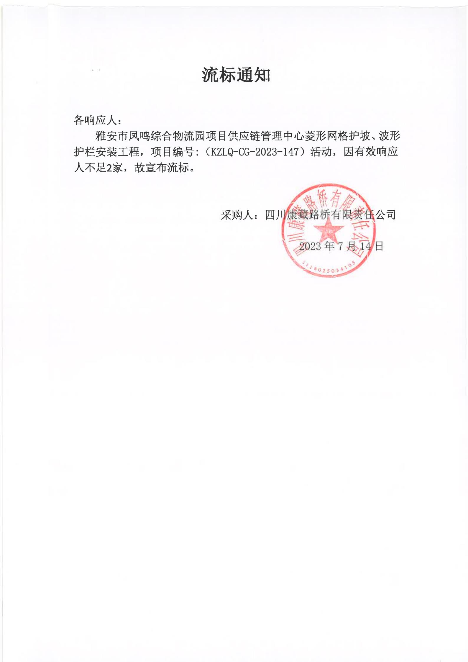 四川康藏路橋有限責(zé)任公司雅安市鳳鳴綜合物流園項目供應(yīng)鏈管理中心菱形網(wǎng)格護(hù)坡、波形護(hù)欄安裝工程采購流標(biāo)通知