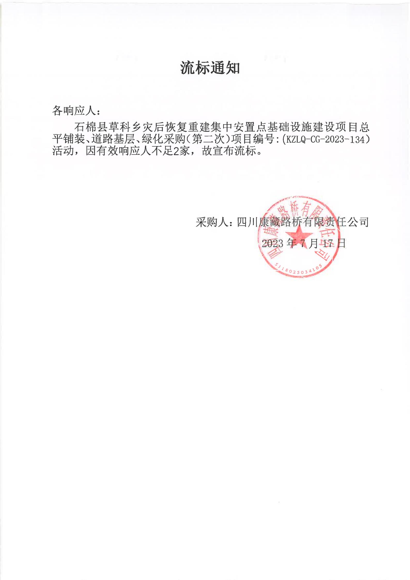 四川康藏路橋有限責(zé)任公司石棉縣草科鄉(xiāng)災(zāi)后恢復(fù)重建集中安置點基礎(chǔ)設(shè)施建設(shè)項目總平鋪裝、道路基層、綠化采購(第二次)流標通知