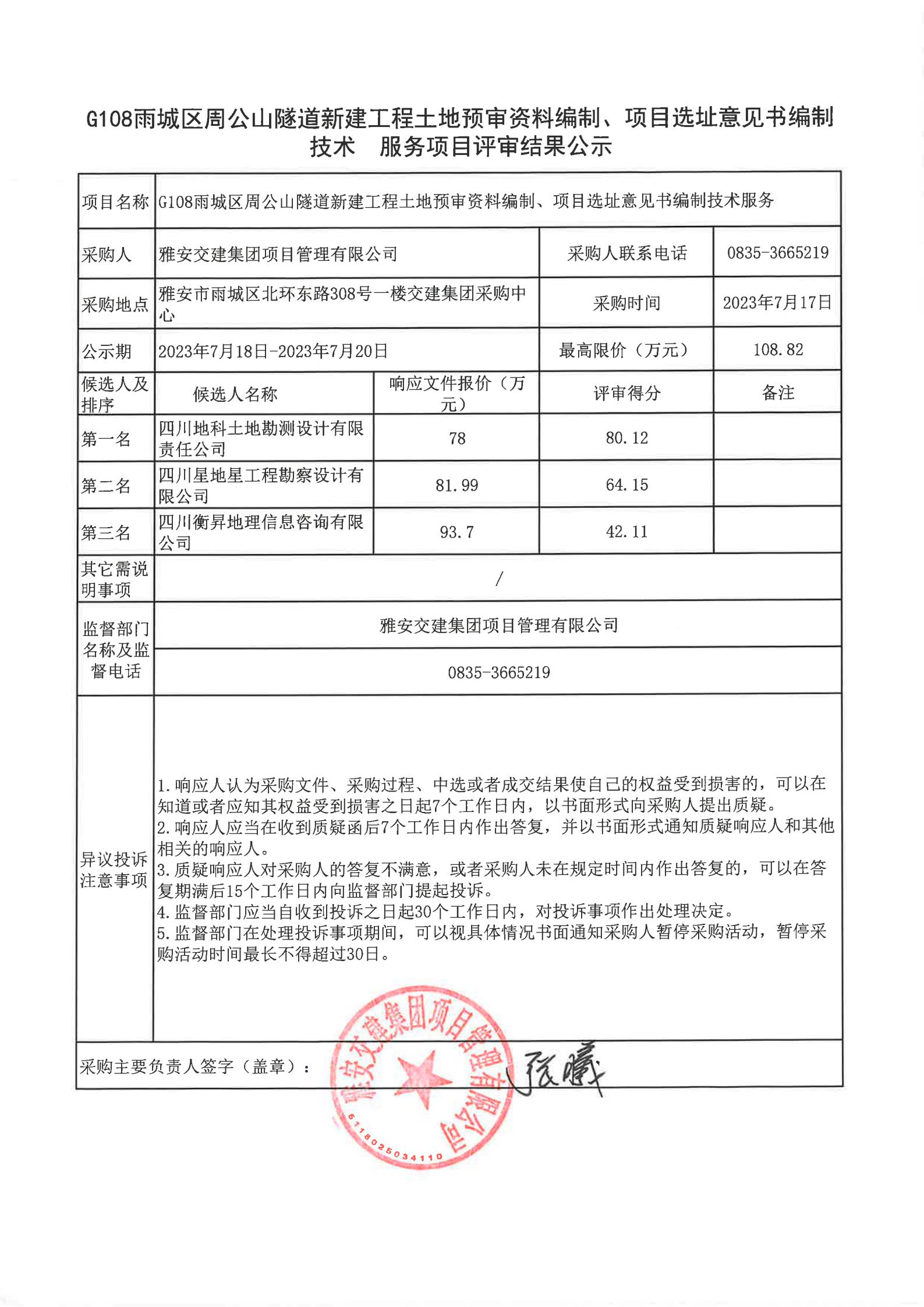 雅安交建集團項目管理有限公司G108雨城區(qū)周公山隧道新建工程土地預審資料編制、項目選址意見書編制技術(shù)服務(wù)項目評審結(jié)果公示