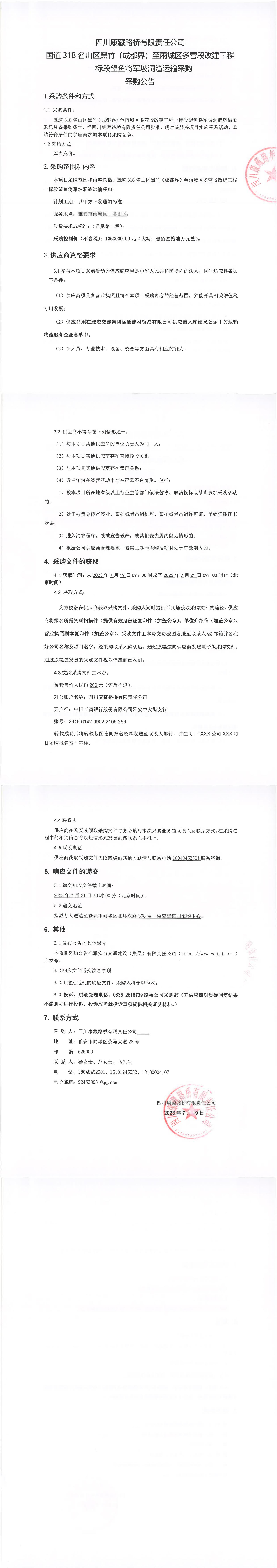 四川康藏路橋有限責(zé)任公司國道318名山區(qū)黑竹(成都界)至雨城區(qū)多營段改建工程一標段望魚將軍坡洞渣運輸采購公告