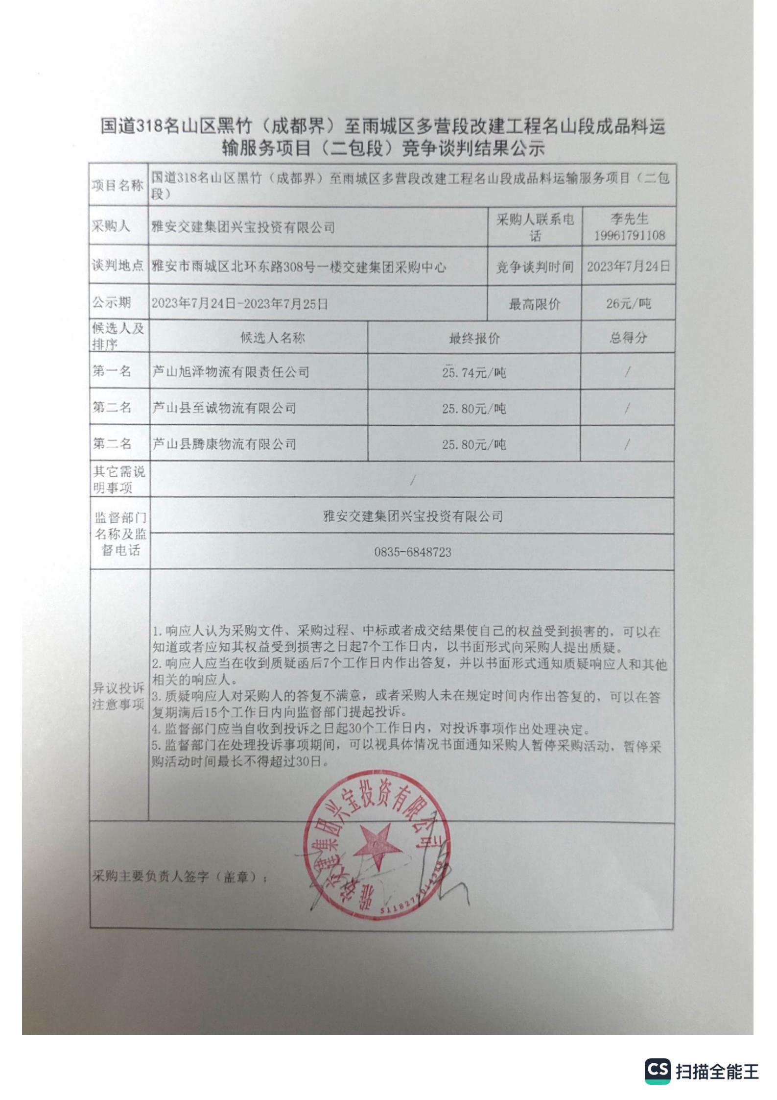 雅安交建集團(tuán)興寶投資有限公司國道318名山區(qū)黑竹(成都界)至雨城區(qū)多營(yíng)段改建工程名山段成品料運(yùn)輸服務(wù)項(xiàng)目(二包段)競(jìng)爭(zhēng)談判結(jié)果公示