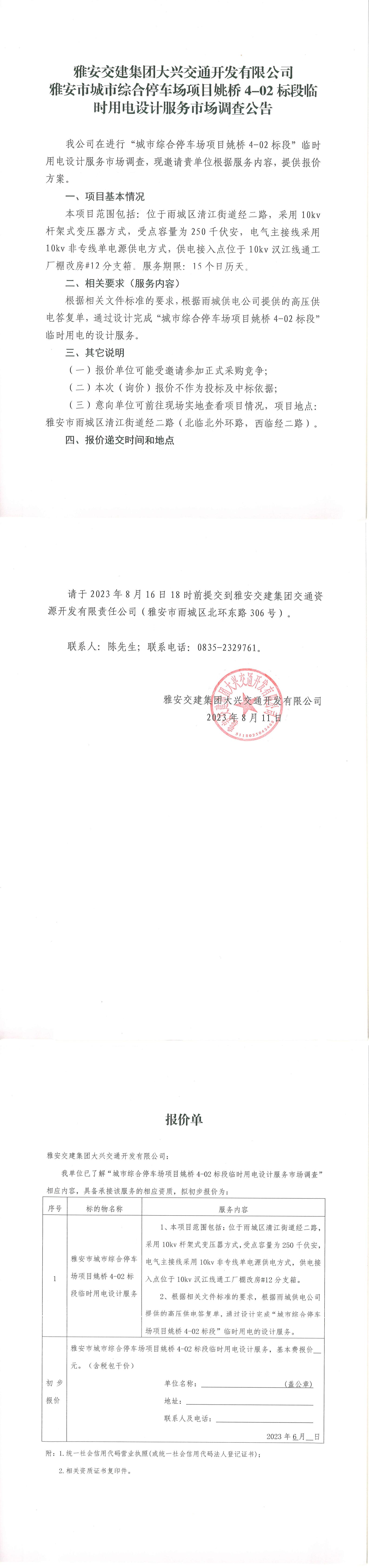 雅安交建集團大興交通開發(fā)有限公司雅安市城市綜合停車場項目姚橋4-02標段臨時用電設計服務市場調(diào)查公告