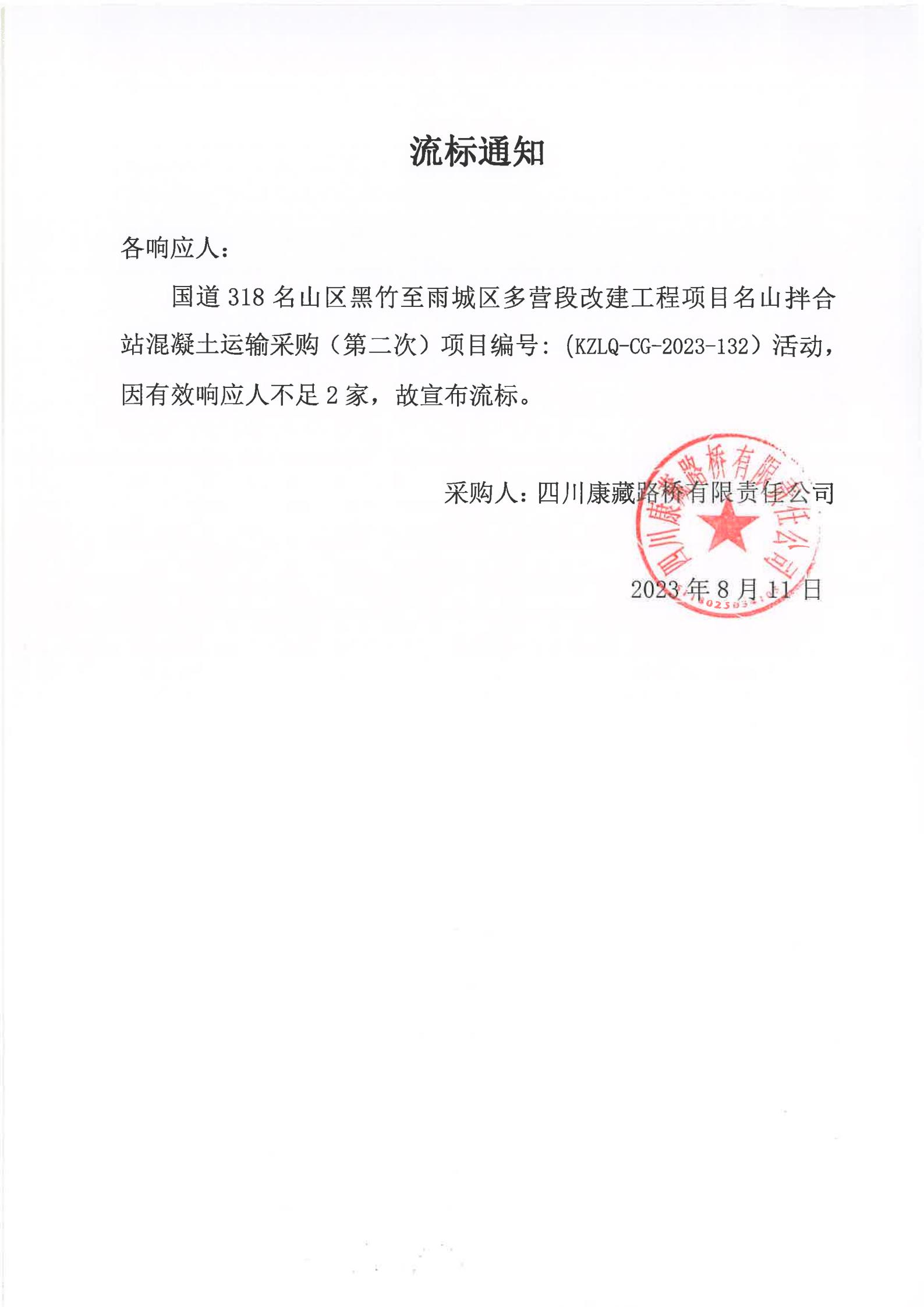 四川康藏路橋有限責(zé)任公司國(guó)道318名山區(qū)黑竹至雨城區(qū)多營(yíng)段改建工程項(xiàng)目名山拌合站混凝土運(yùn)輸服務(wù)(第二次)流標(biāo)通知)
