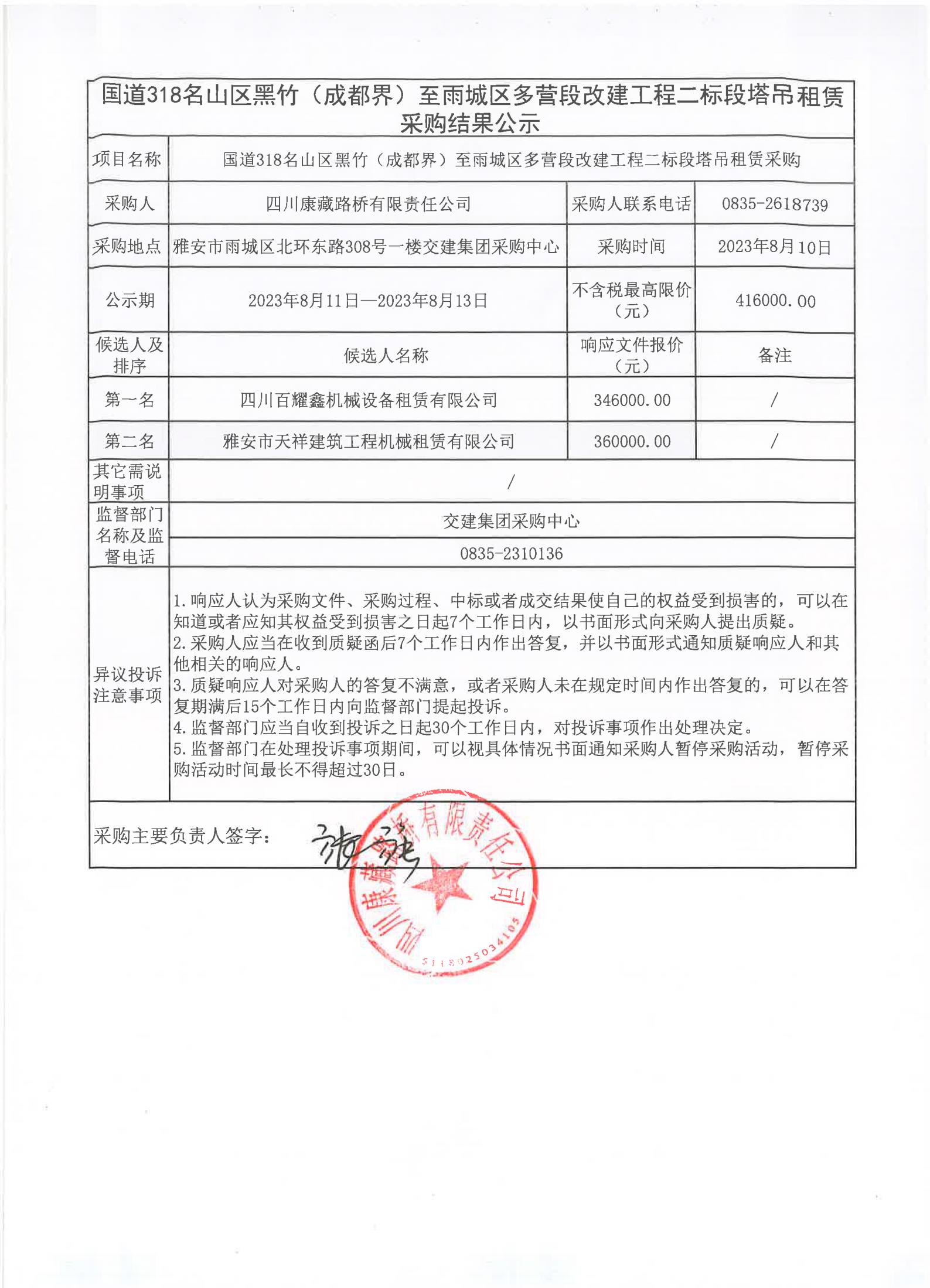 四川康藏路橋有限責(zé)任公司國道318名山區(qū)黑竹(成都界)至雨城區(qū)多營段改建工程二標(biāo)段塔吊租賃采購結(jié)果公示
