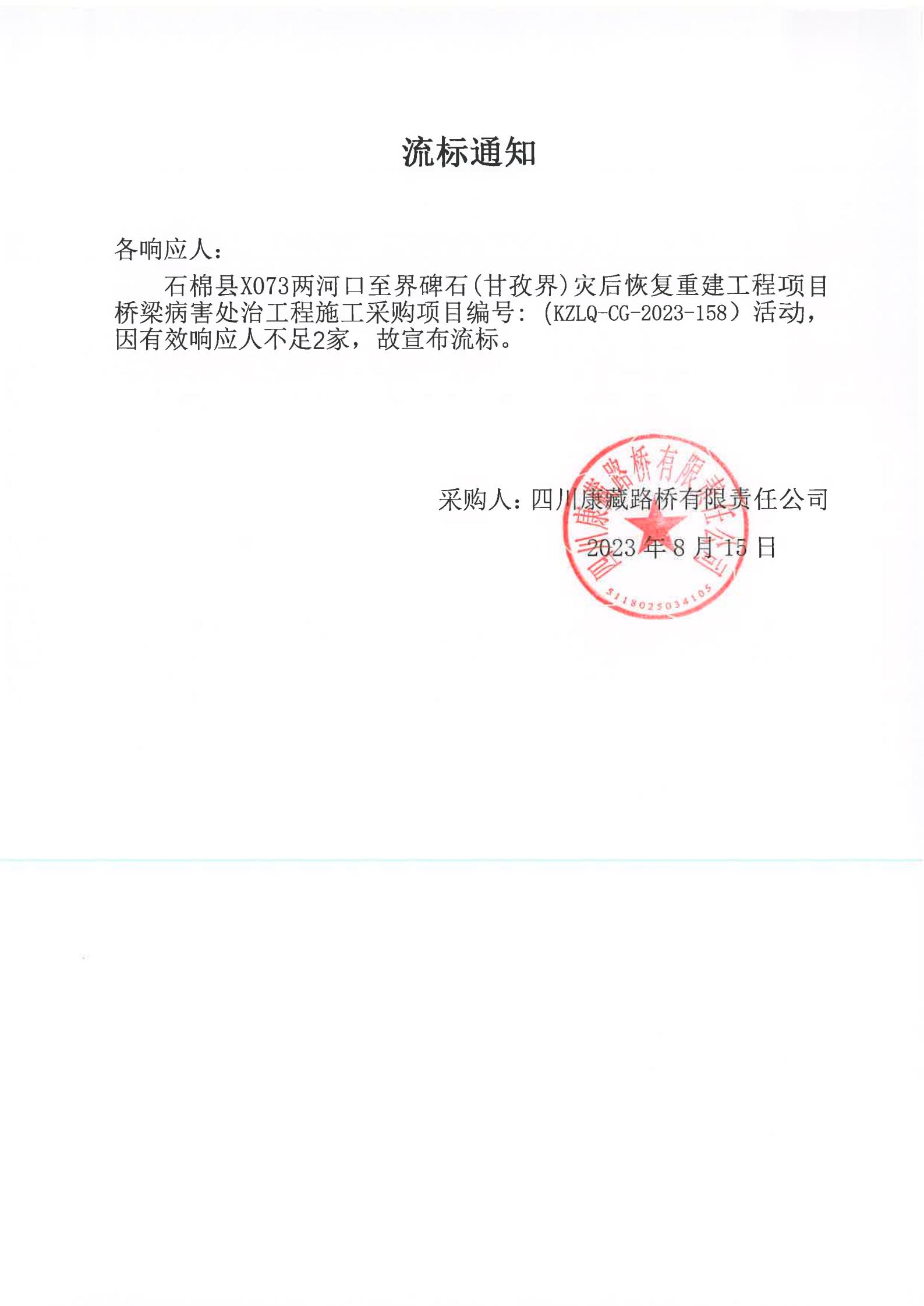 四川康藏路橋有限責(zé)任公司石棉縣X703兩河口至界碑石(甘孜界)災(zāi)后恢復(fù)重建工程項目橋梁病害處治工程施工流標(biāo)通知