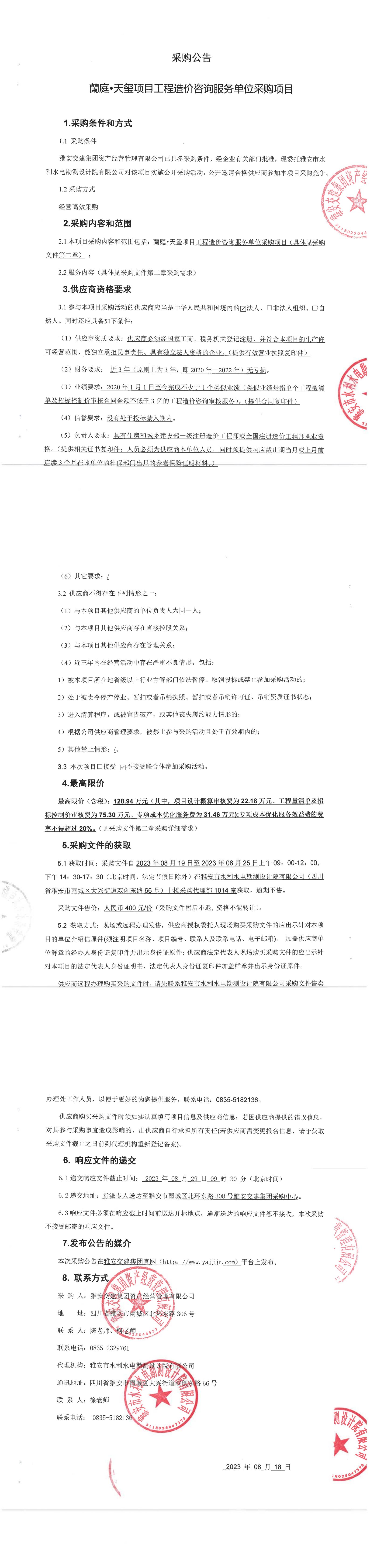 雅安交建集團(tuán)資產(chǎn)經(jīng)營(yíng)管理有限公司蘭庭·天璽項(xiàng)目工程造價(jià)咨詢(xún)服務(wù)單位采購(gòu)項(xiàng)目采購(gòu)公告