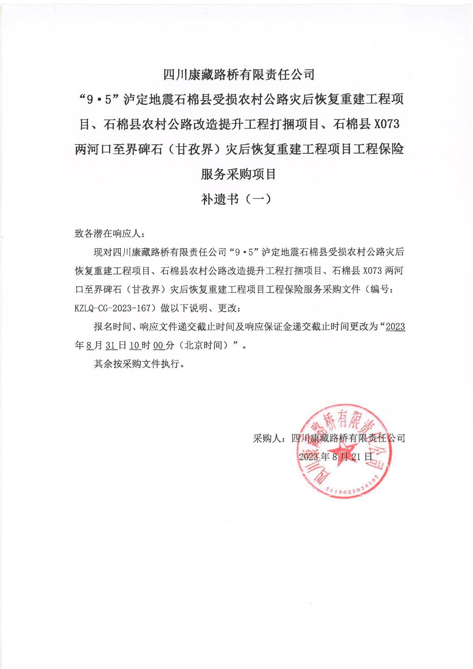 四川康藏路橋有限責(zé)任公司“9·5”瀘定地震石棉縣受損農(nóng)村公路災(zāi)后恢復(fù)重建工程項目、石棉縣農(nóng)村公路改造提升工程打捆項目、石棉縣X073兩河口至界碑石(甘孜界)災(zāi)后恢復(fù)重建工程項目工程保險服務(wù)采購項目補(bǔ)遺書(一)