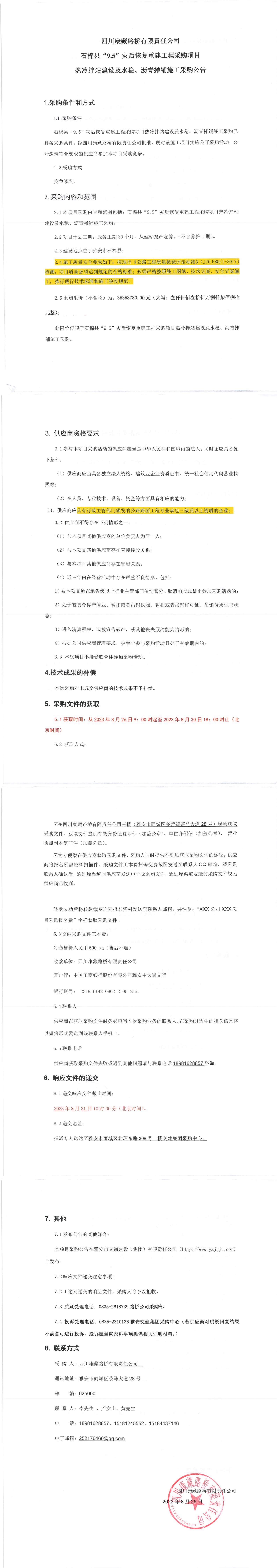 四川康藏路橋有限責(zé)任公司石棉縣“9.5”災(zāi)后恢復(fù)重建工程采購項目熱冷拌站建設(shè)及水穩(wěn)、瀝青攤鋪施工采購公告
