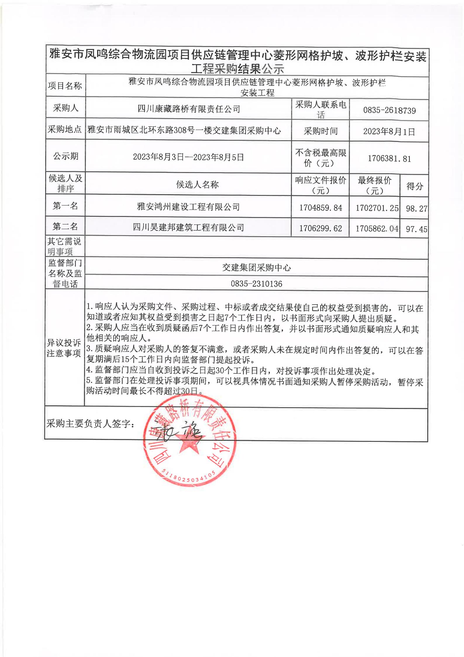 四川康藏路橋有限責任公司雅安市鳳鳴綜合物流園項目供應(yīng)鏈管理中心菱形網(wǎng)格護坡、波形護欄安裝工程采購結(jié)果公示
