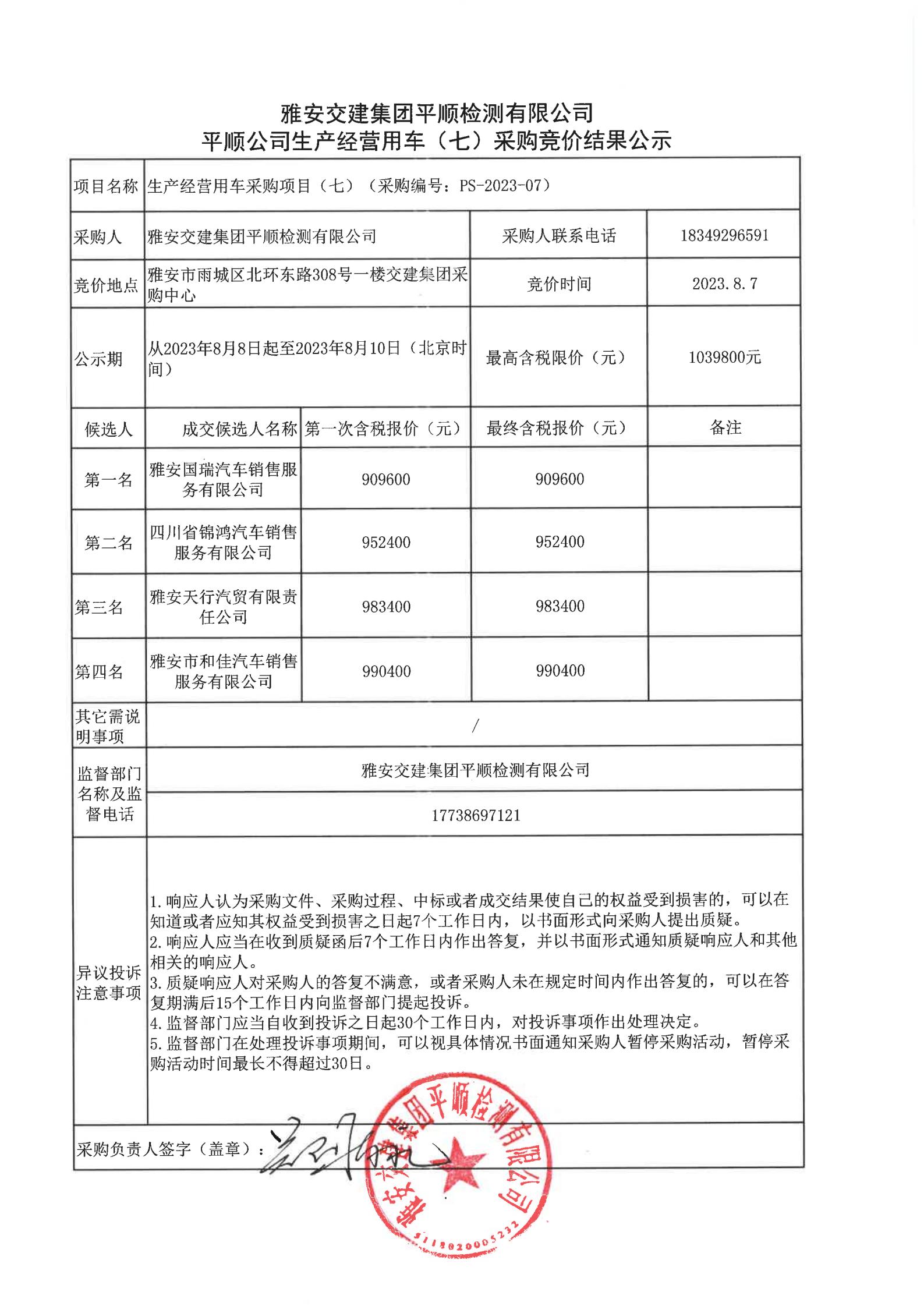 雅安交建集團(tuán)平順檢測有限公司平順公司生產(chǎn)經(jīng)營用車(七)采購競價(jià)結(jié)果公示