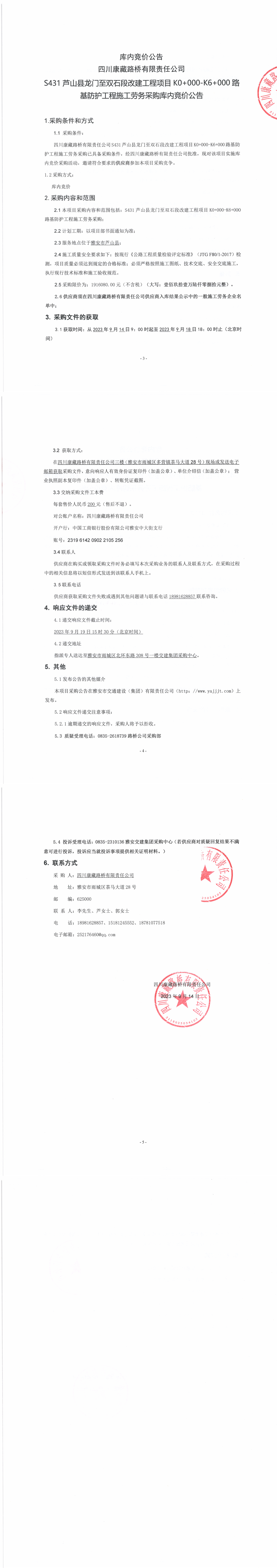 四川康藏路橋有限責(zé)任公司S431蘆山縣龍門至雙石段改建工程項(xiàng)目K0+000-K6+000路基防護(hù)工程施工勞務(wù)采購(gòu)公告