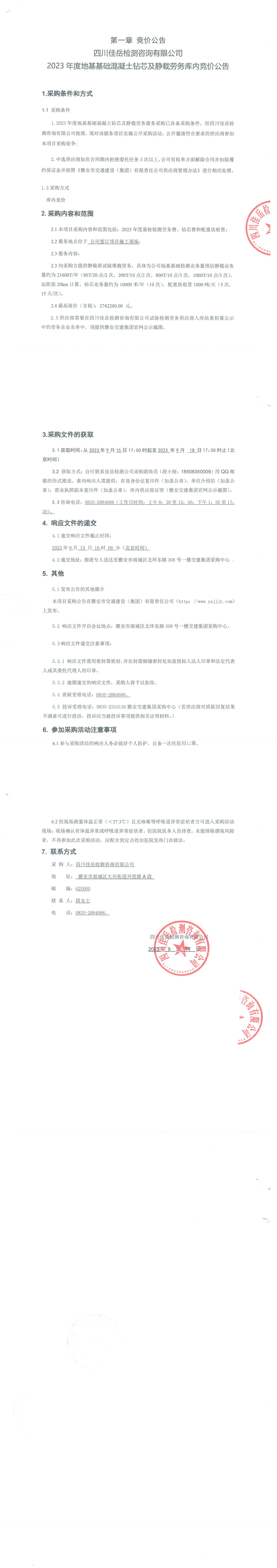 四川佳岳檢測咨詢有限公司2023年度地基基礎混凝土鉆芯及靜載勞務庫內競價公告