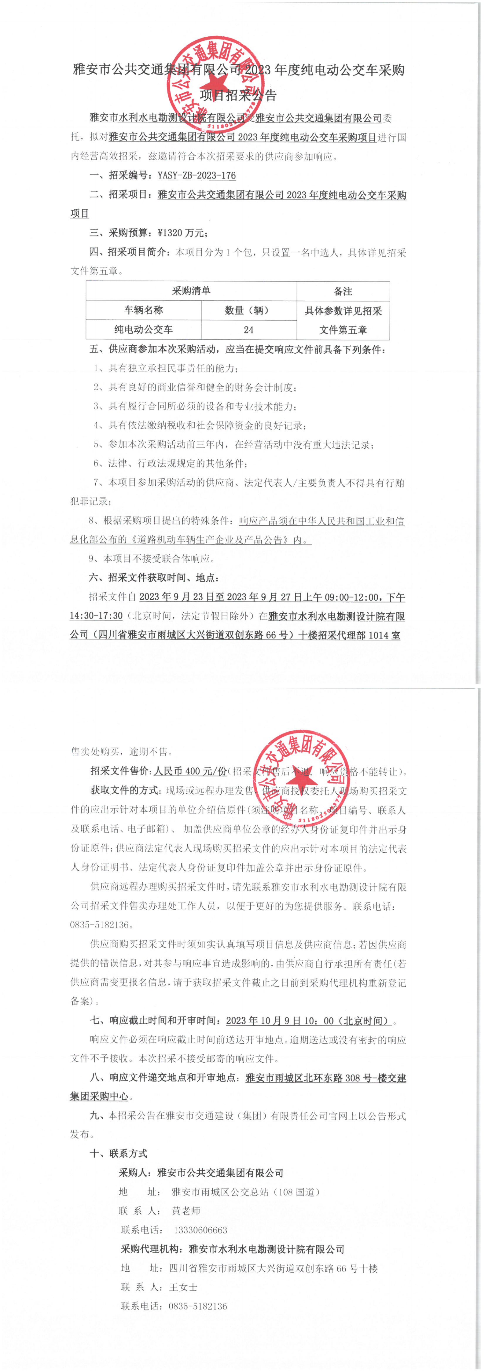 雅安市公共交通集團(tuán)有限公司2023年度純電動車公交車采購項目招采公告