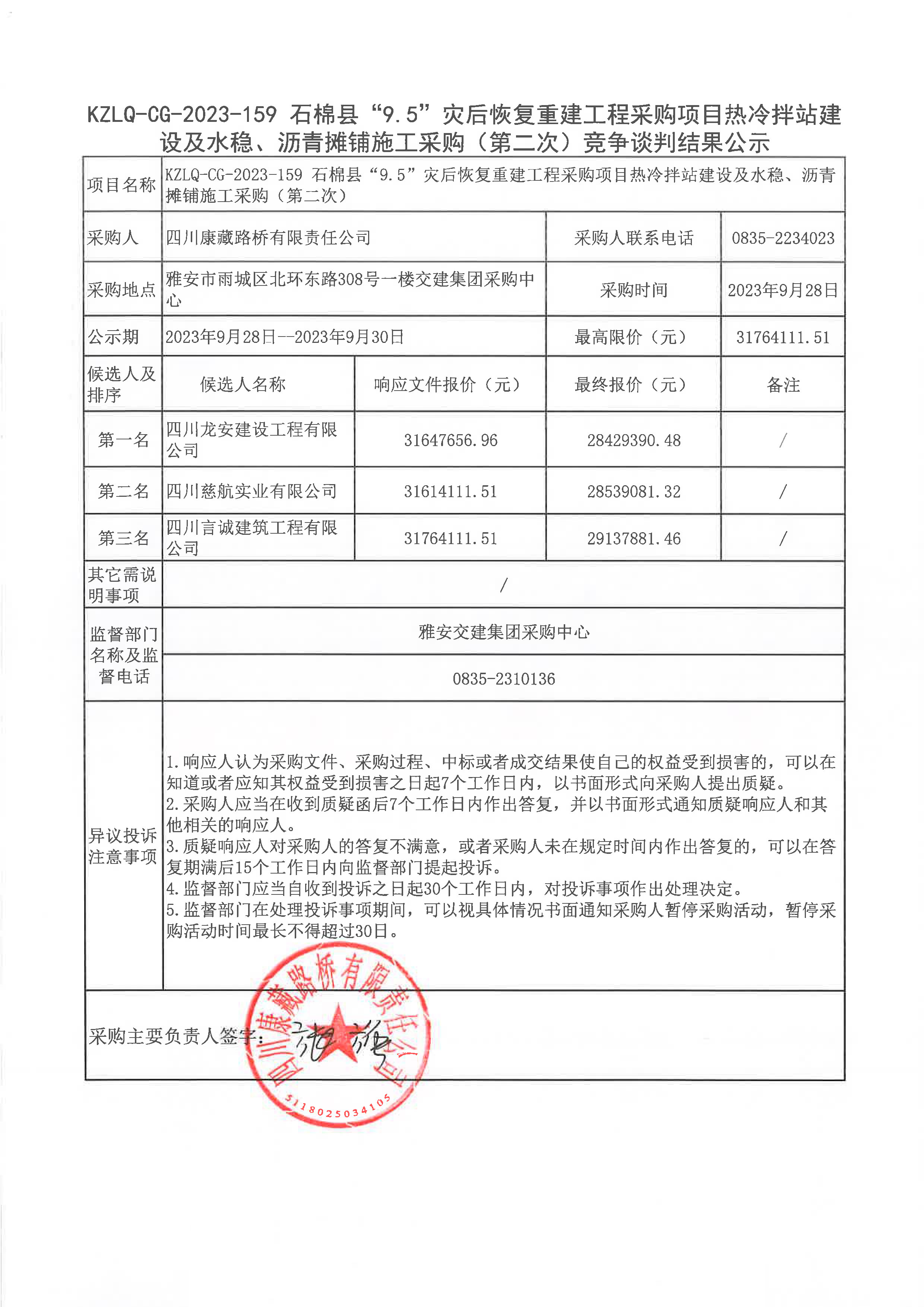 四川康藏路橋有限責任公司石棉縣“9.5”災后恢復重建工程采購項目熱冷拌站建設及水穩(wěn)、瀝青攤鋪施工采購(第二次)競爭談判結果公示