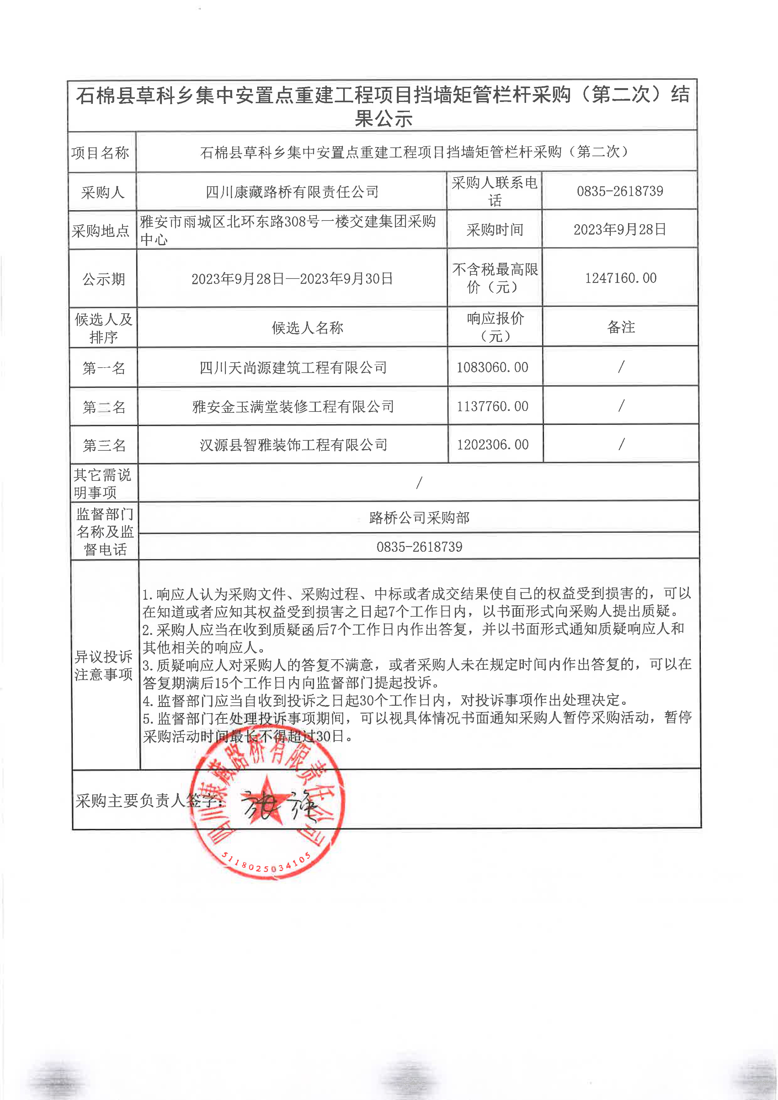 四川康藏路橋有限責任公司石棉縣草科鄉(xiāng)集中安置點重建工程項目擋墻矩管欄桿采購(第二次)結果公示
