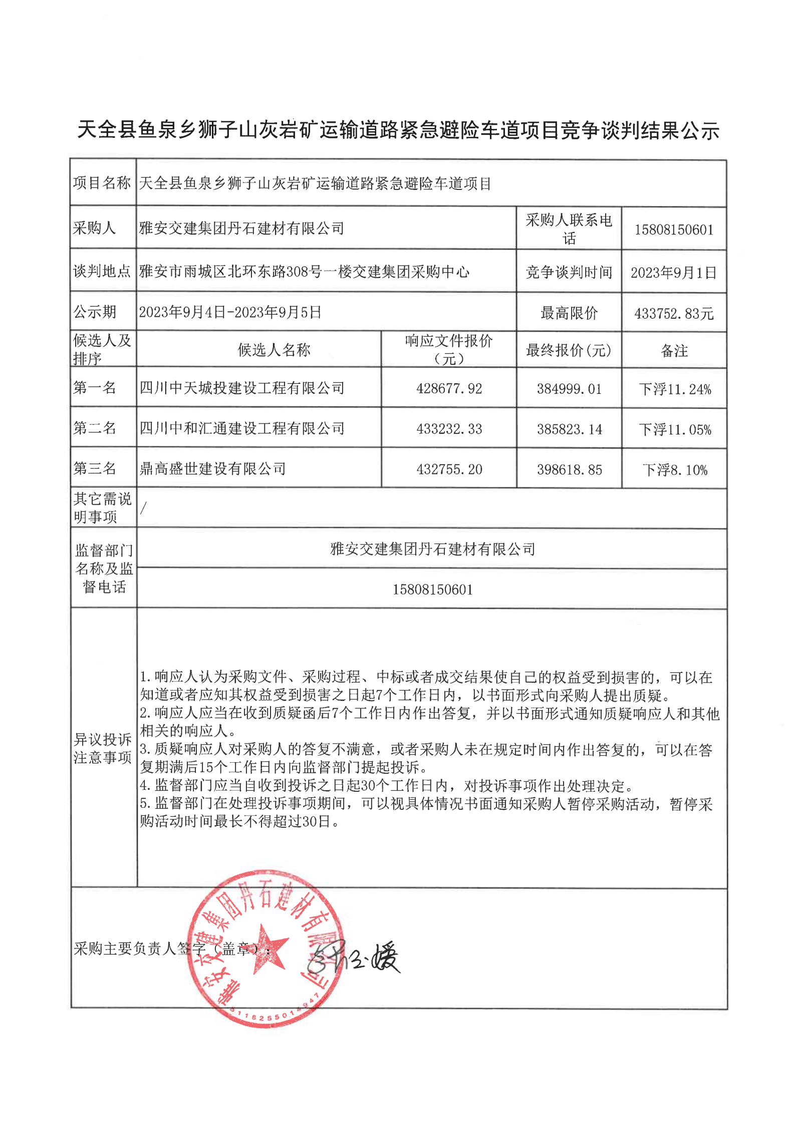 雅安交建集團(tuán)丹石建材有限公司天全縣魚泉鄉(xiāng)獅子山灰?guī)r礦運(yùn)輸?shù)缆肪o急避險車道項(xiàng)目競爭談判結(jié)果公示