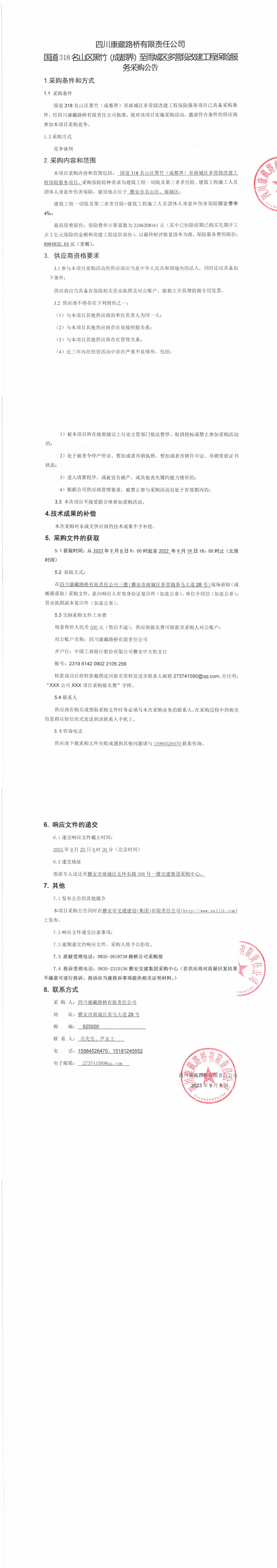 四川康藏路橋有限責(zé)任公司國道318名山區(qū)黑竹(成都界)至雨城區(qū)多營段改建工程保險服務(wù)采購公告
