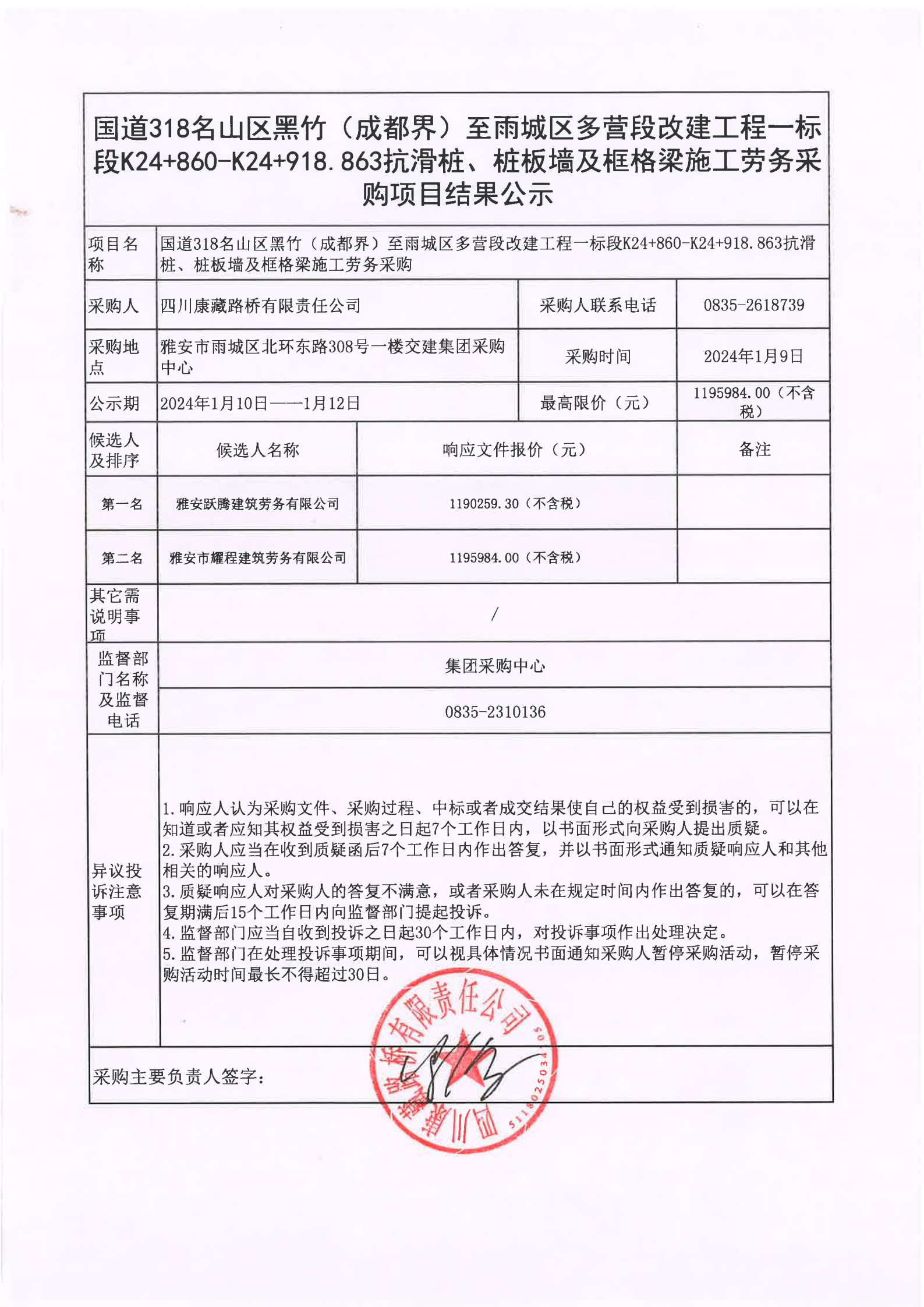四川康藏路橋有限責任公司國道318名山區(qū)黑竹(成都界)至雨城區(qū)多營段改建工程一標段K24+860-K24+918.863抗滑樁、樁板墻及框格梁施工勞務(wù)采購項目結(jié)果公示