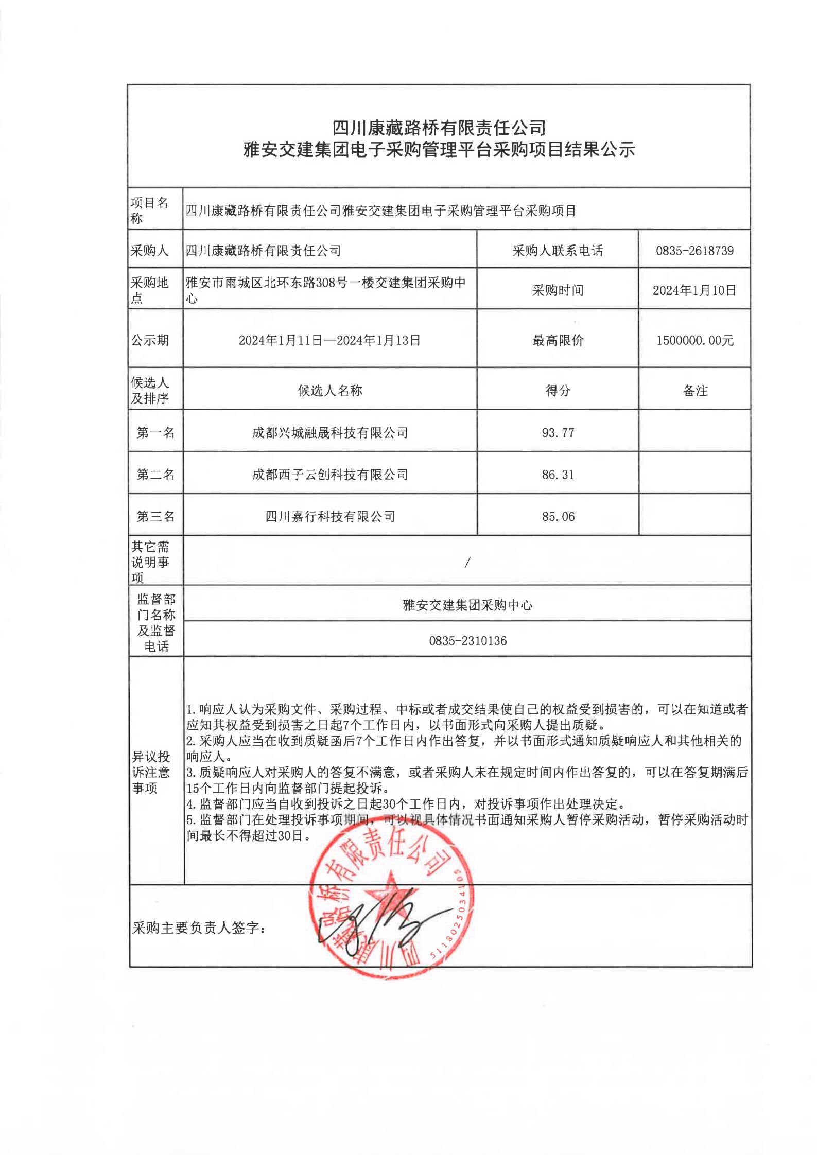 四川康藏路橋有限責任公司雅安交建集團電子采購管理平臺采購項目結(jié)果公示