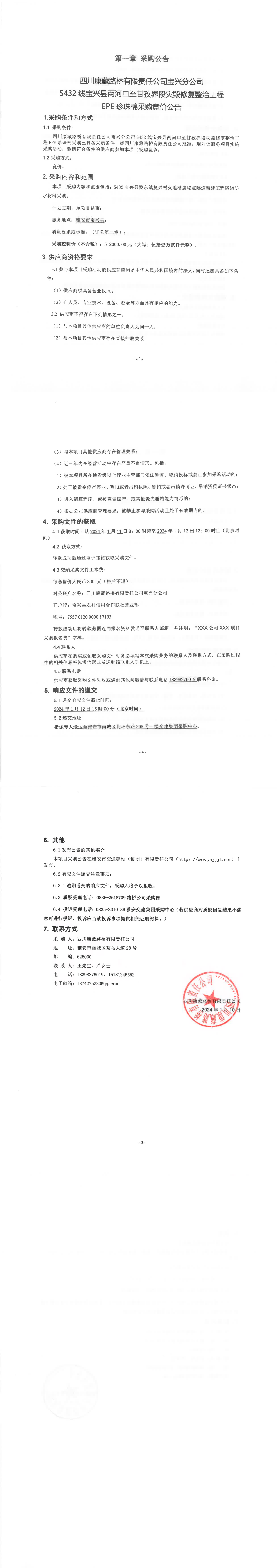 四川康藏路橋有限責(zé)任公司寶興分公司S432線寶興縣兩河口至甘孜界段災(zāi)毀修復(fù)整治工程EPE珍珠棉采購(gòu)競(jìng)價(jià)公告