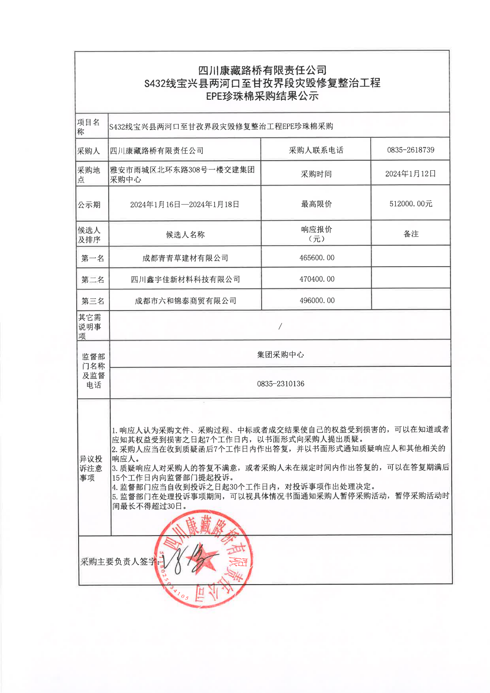 四川康藏路橋有限責(zé)任公司S432線寶興縣兩河口至甘孜界段災(zāi)毀修復(fù)整治工程EOE珍珠棉采購(gòu)結(jié)果公示
