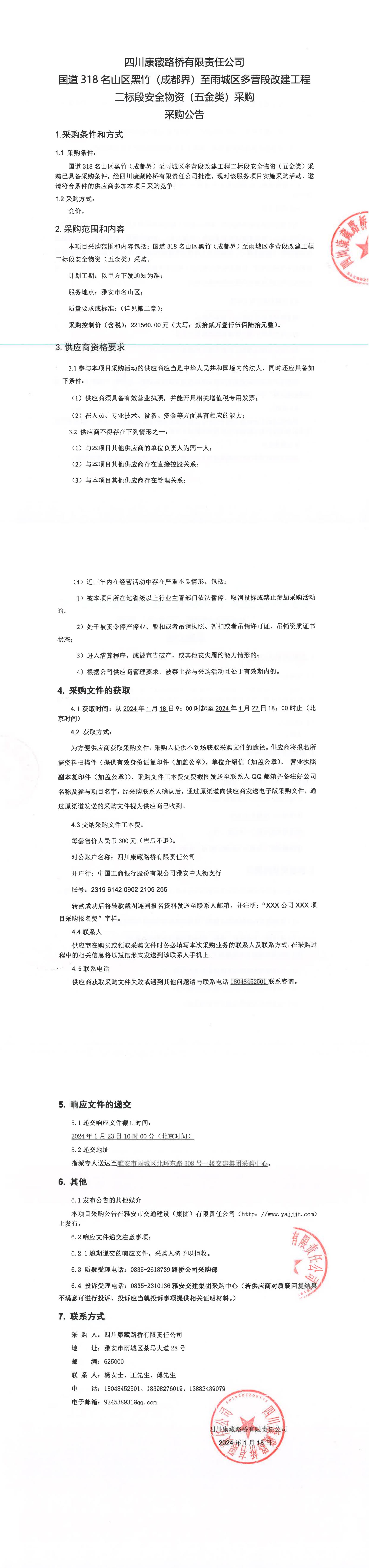 四川康藏路橋有限責任公司國道318名山區(qū)黑竹(成都界)至名山區(qū)多營段改建工程二標段安全物資(五金類)采購公告