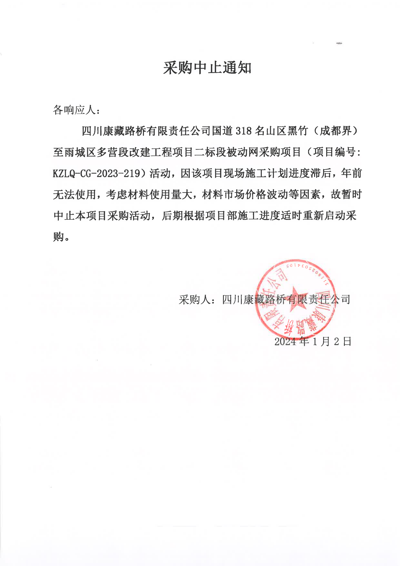 四川康藏路橋有限責(zé)任公司國(guó)道318名山區(qū)黑竹(成都界)至雨城區(qū)多營(yíng)段改建工程項(xiàng)目二標(biāo)段被動(dòng)網(wǎng)采購(gòu)項(xiàng)目采購(gòu)中止通知