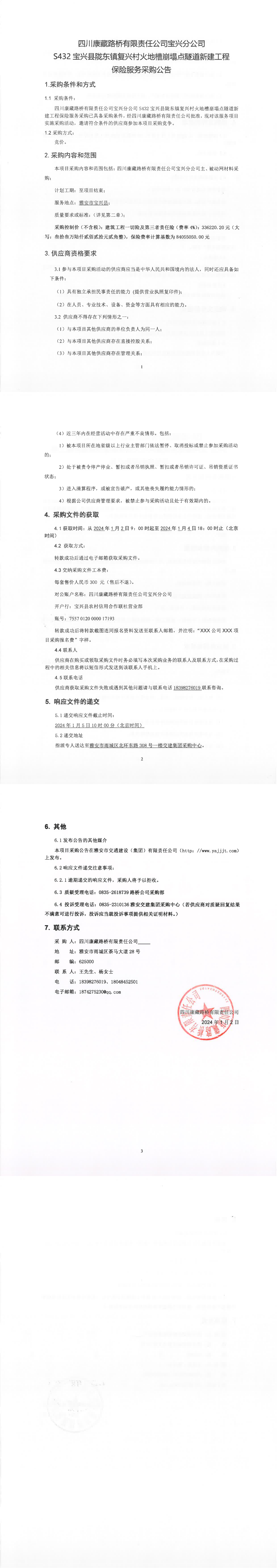 四川康藏路橋有限責任公司寶興分公司S432寶興縣隴東鎮(zhèn)復興村火地槽崩塌點隧道新建工程保險服務采購公告