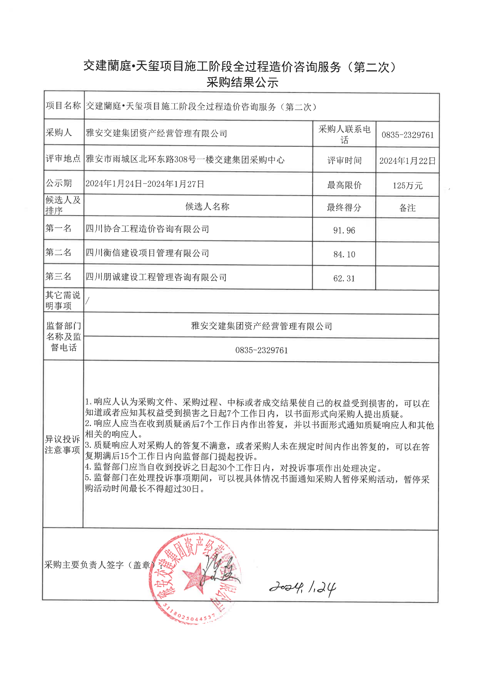 雅安交建集團資產(chǎn)經(jīng)營管理有限公司交建蘭庭·天璽項目施工階段全過程造價咨詢服務(第二次)采購結果公示