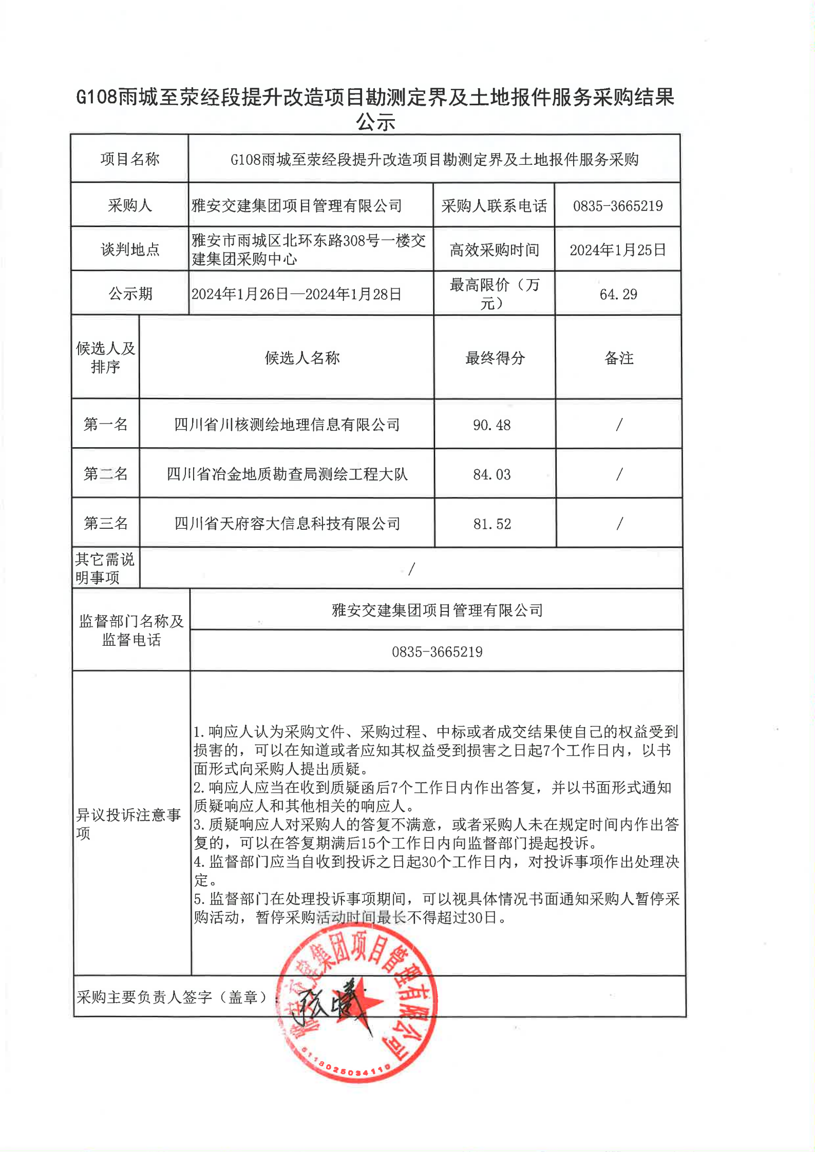 四川康藏路橋有限責(zé)任公司G108雨城至滎經(jīng)段提升改造項(xiàng)目勘測定界及土地報件服務(wù)采購結(jié)果公示