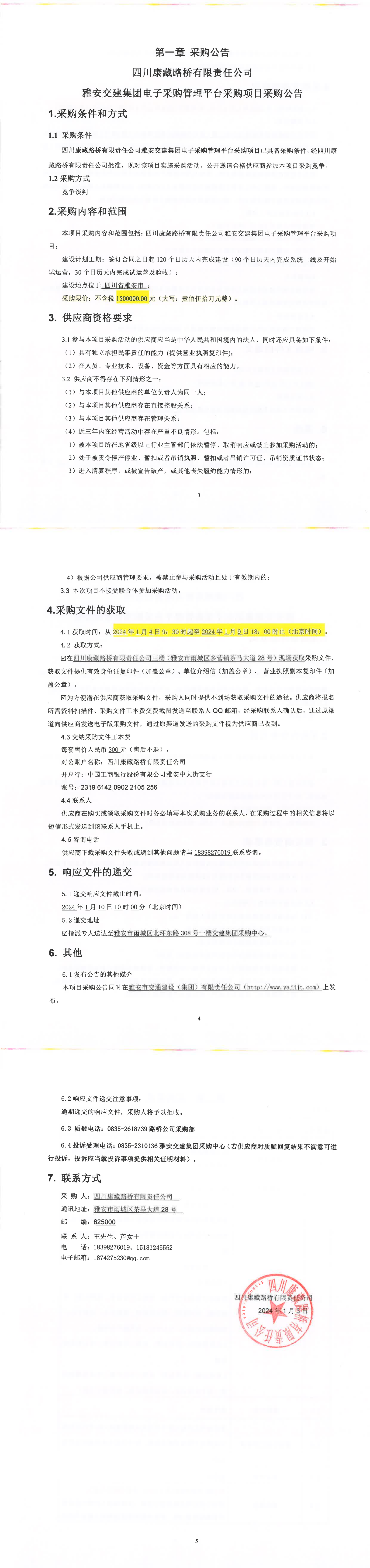 四川康藏路橋有限責(zé)任公司雅安交建集團(tuán)電子采購(gòu)管理平臺(tái)采購(gòu)項(xiàng)目采購(gòu)公告