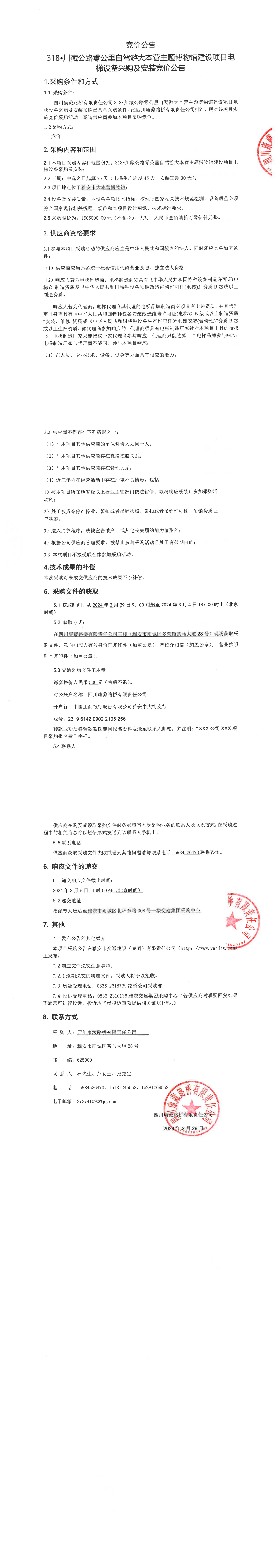四川康藏路橋有限責(zé)任公司318·川藏公路零公里自駕游大本營(yíng)主題博物館建設(shè)項(xiàng)目電梯設(shè)備采購(gòu)及安裝競(jìng)價(jià)公告