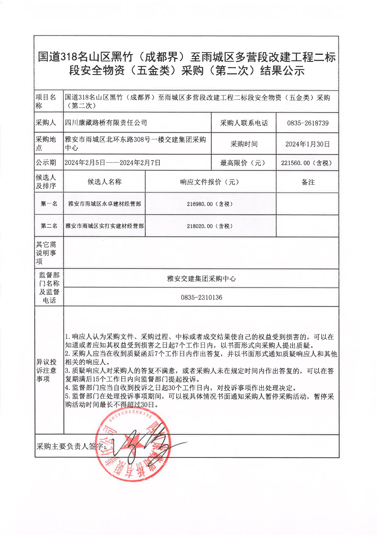 四川康藏路橋有限責(zé)任公司國(guó)道318名山區(qū)黑竹(成都界)至雨城區(qū)多營(yíng)段改建工程二標(biāo)段安全物資(五金類)采購(gòu)(第二次)結(jié)果公示