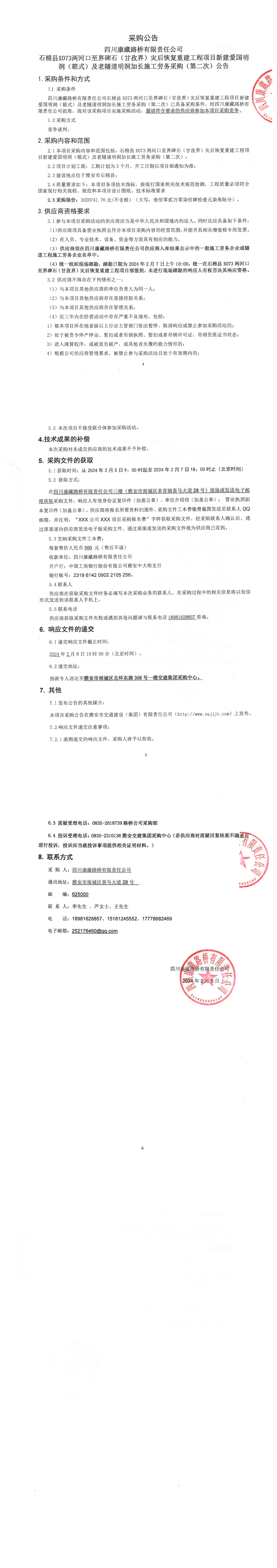 四川康藏路橋有限責(zé)任公司石棉縣X073兩河口至界碑石(甘孜界)災(zāi)后恢復(fù)重建工程項(xiàng)目新建愛國(guó)明洞(箱式)及老隧道明洞加長(zhǎng)施工勞務(wù)采購(gòu)(第二次)公告