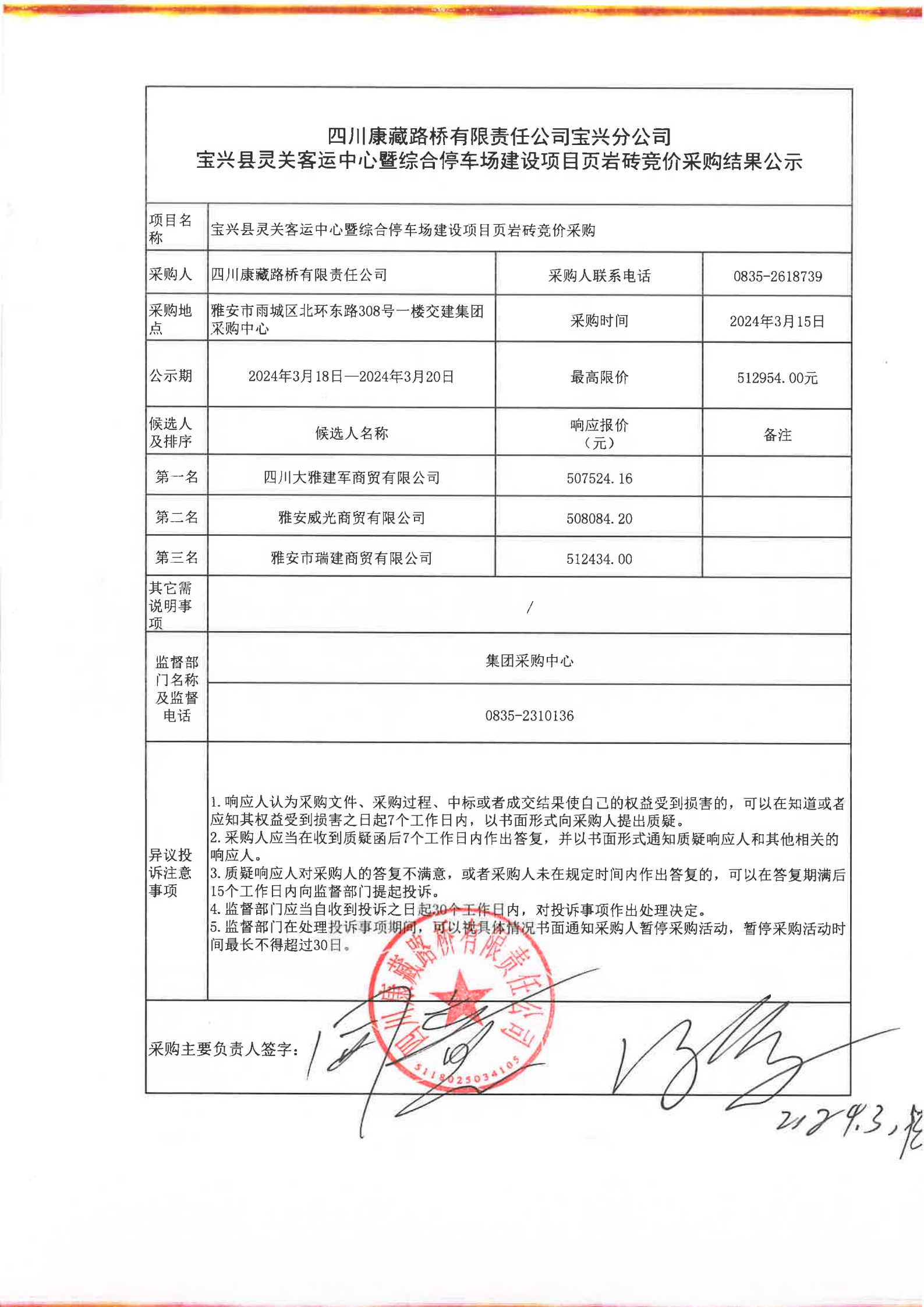四川康藏路橋有限責任公司寶興分公司寶興縣靈關(guān)客運中心暨綜合停車場建設(shè)項目頁巖磚競價采購結(jié)果公示