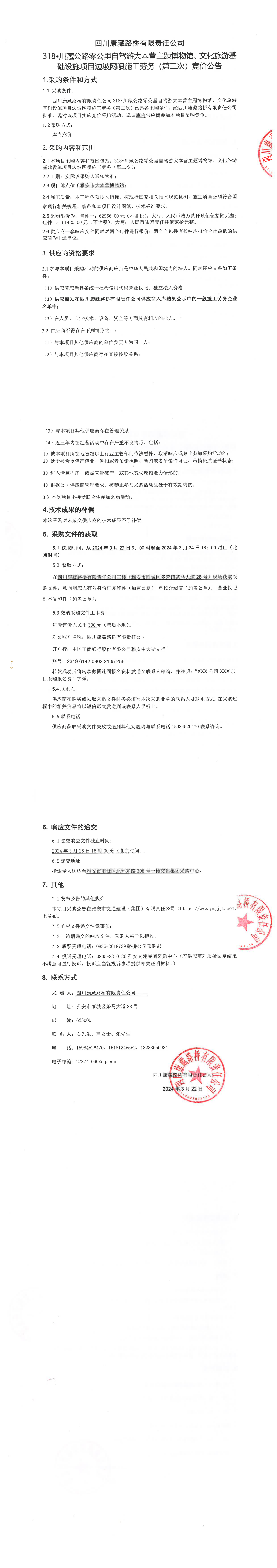 四川康藏路橋有限責(zé)任公司318·川藏公路零公里自駕游大本營主題博物館、文化旅游基礎(chǔ)設(shè)施項(xiàng)目邊坡網(wǎng)噴施工勞務(wù)(第二次)競價(jià)公告
